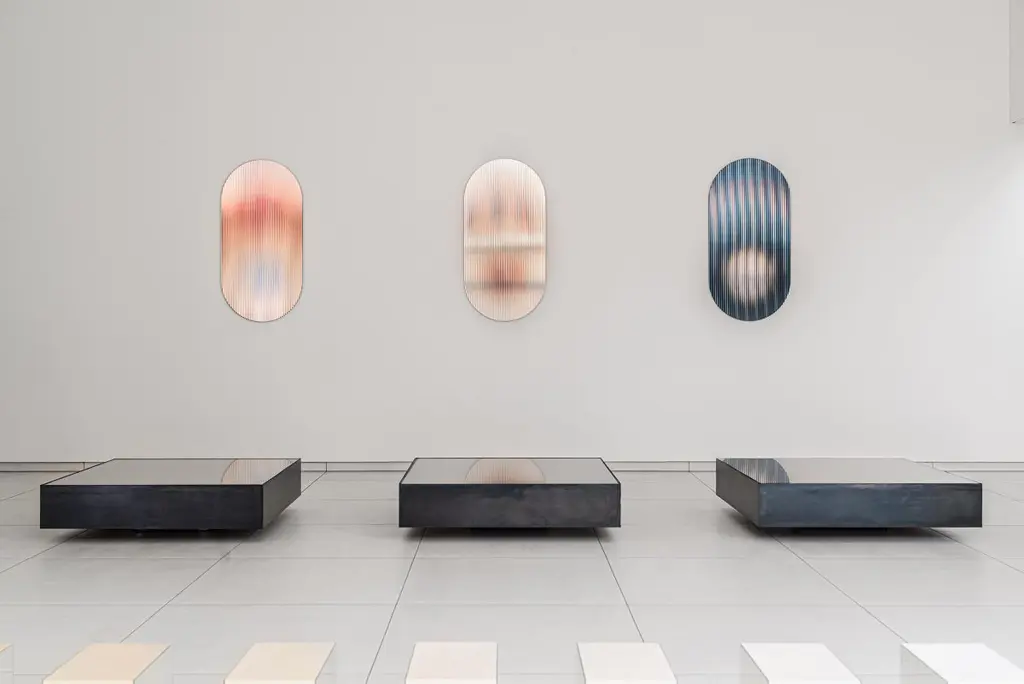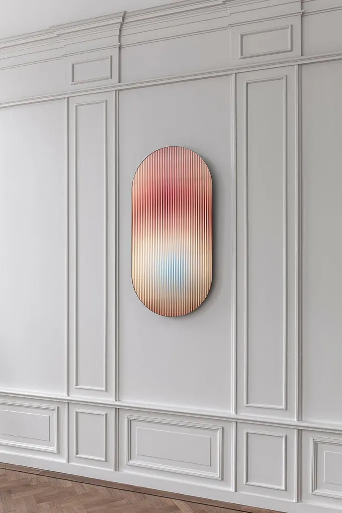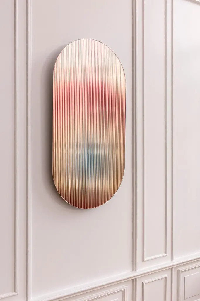 The reflective, coloured, rippled glass panel – designed to add a palette of colour to spaces – reflects light in spaces and adds movement and color whilst creating abstracted reflections. The piece disperses light through its rippled surface creating transitions of colour from various viewpoints. It works as an artistic object for spaces and has been designed with the intention of use for larger scale interior and architectural projects. It ships with a hanging system suitable for most wall types.Item is typically shipped in a custom wooden art crate which will be quoted separately with the shipping cost.