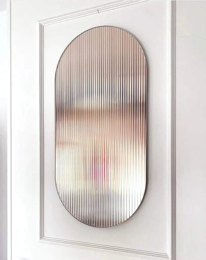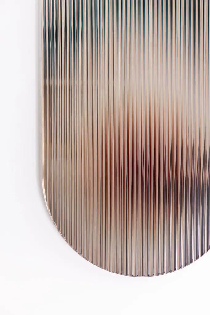 The reflective, coloured, rippled glass panel – designed to add a palette of colour to spaces – reflects light in spaces and adds movement and color whilst creating abstracted reflections. The piece disperses light through its rippled surface creating transitions of colour from various viewpoints. It works as an artistic object for spaces and has been designed with the intention of use for larger scale interior and architectural projects. It ships with a hanging system suitable for most wall types.Item is typically shipped in a custom wooden art crate which will be quoted separately with the shipping cost.