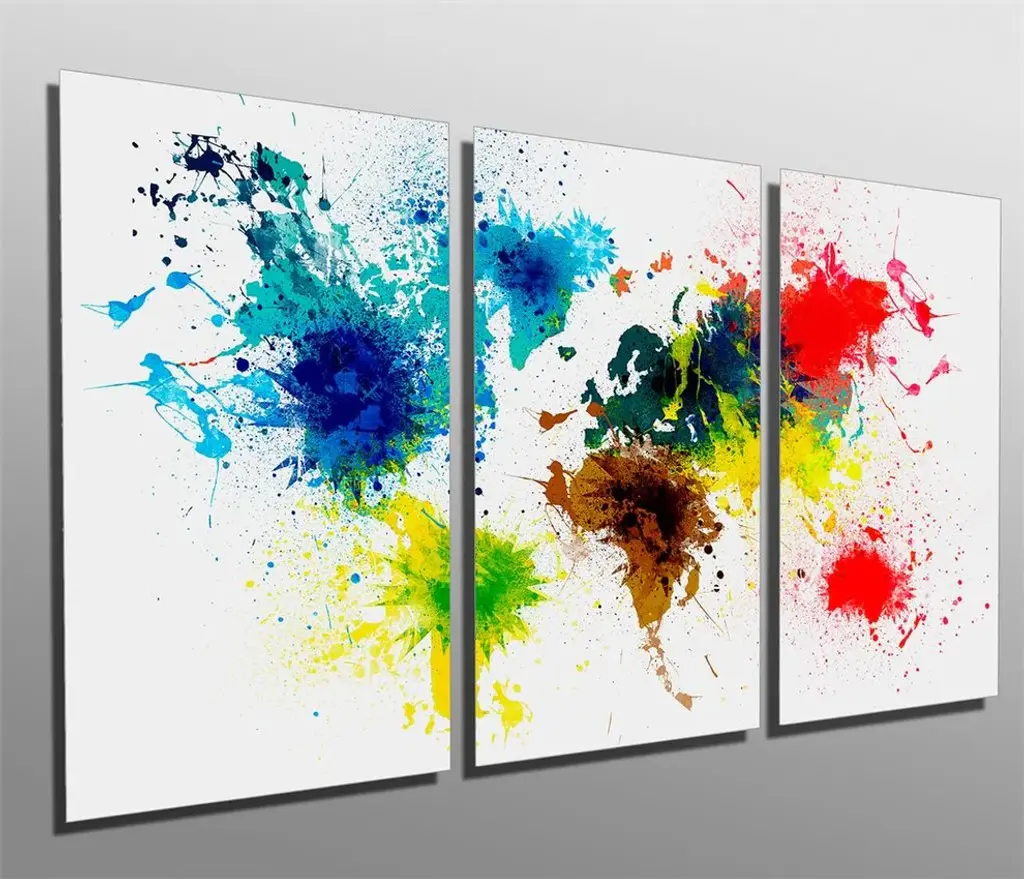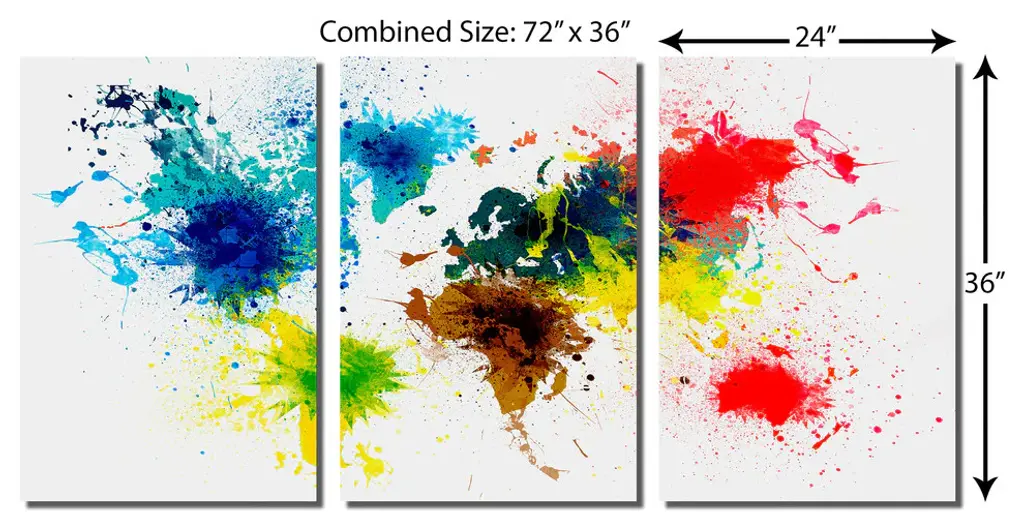 72"œ x 36"œ total size. Ready To Hang! (3 pieces - 24"œ x 36"œ each). 3 Panel Split (Triptych) Color splash Abstract art World Map Metal Print. Modern metal wall art for home or office wall decor & interior design. Printed on Luxurious, HD aluminum glossy metal panels. Multi panel art.. HD aluminum panels. Metal print wall art. Includes Shadow Wall Mount on the back.• Aluminum Metal Wall Art• Made in USA• Ready to hang - No assembly required• Shadow mount hardware on the back• 0.045"œ thick HD Aluminum Panels• Scratch resistant, glossy finish• Superb color clarity, luxurious prints• Epson printing process• For indoor or moisture rich environment use• Easy to clean. Gently wipe with microfiber cloth.
