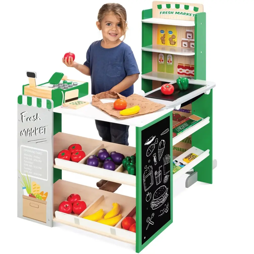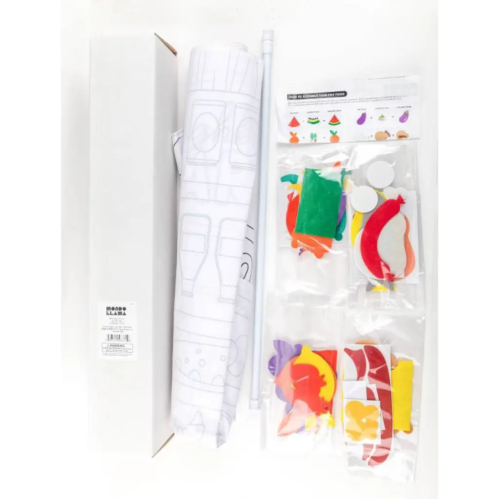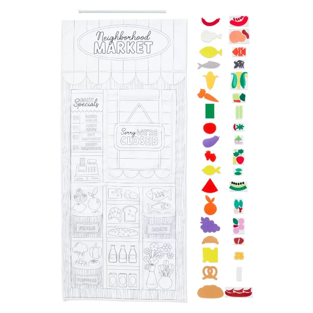 Enjoy fun crafts with your kids with this Color-Your-Own Door Store Front Craft Kit from Mondo Llama™. This craft kit features a frame with a sketch of a storefront on fabric. The storefront features multiple drawings of veggies, fruits, and more along with the text "Neighborhood Market". They can create colorful oranges, watermelon, carrots, and other foods from the felt pieces and use the markers and felt foods to decorate the storefront. Place the finished product on the mantel or console table to show off their work.Mondo Llama™: Find your creativity in the making.