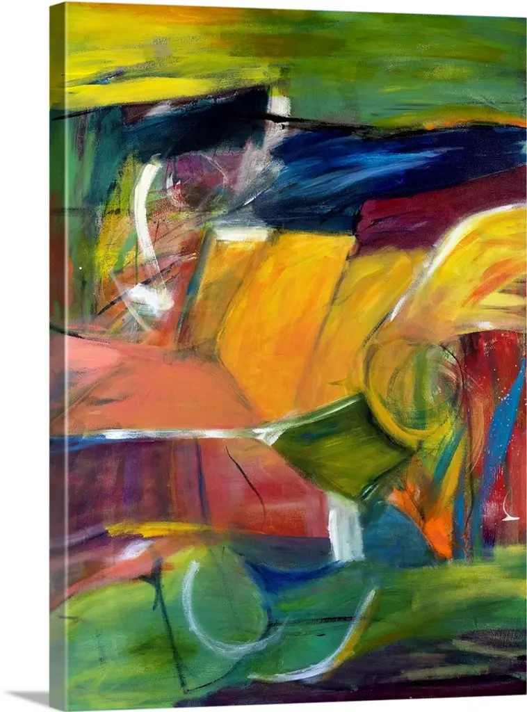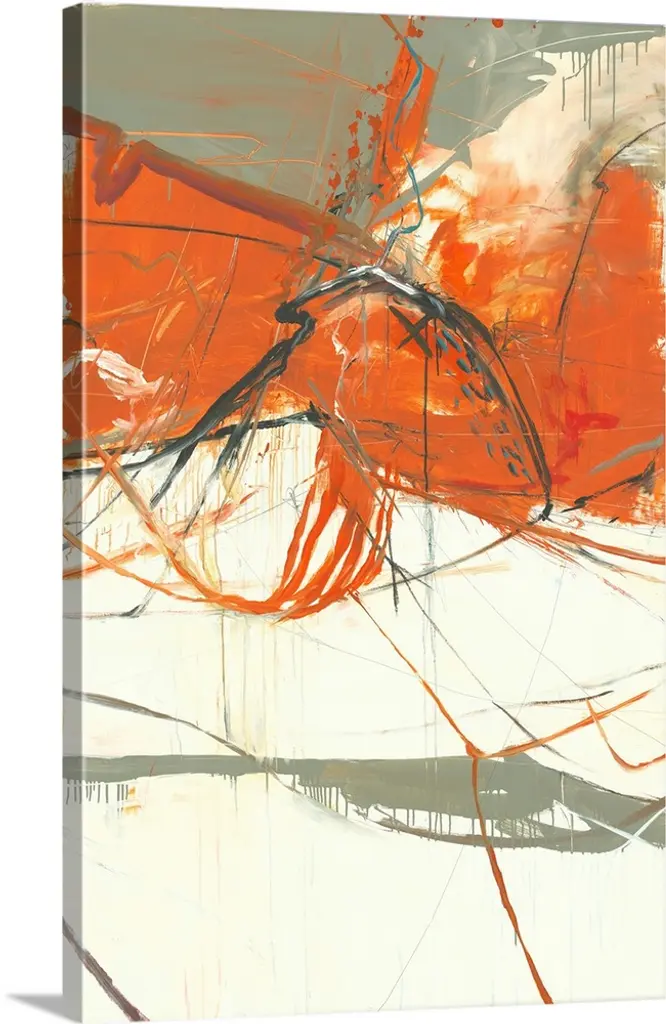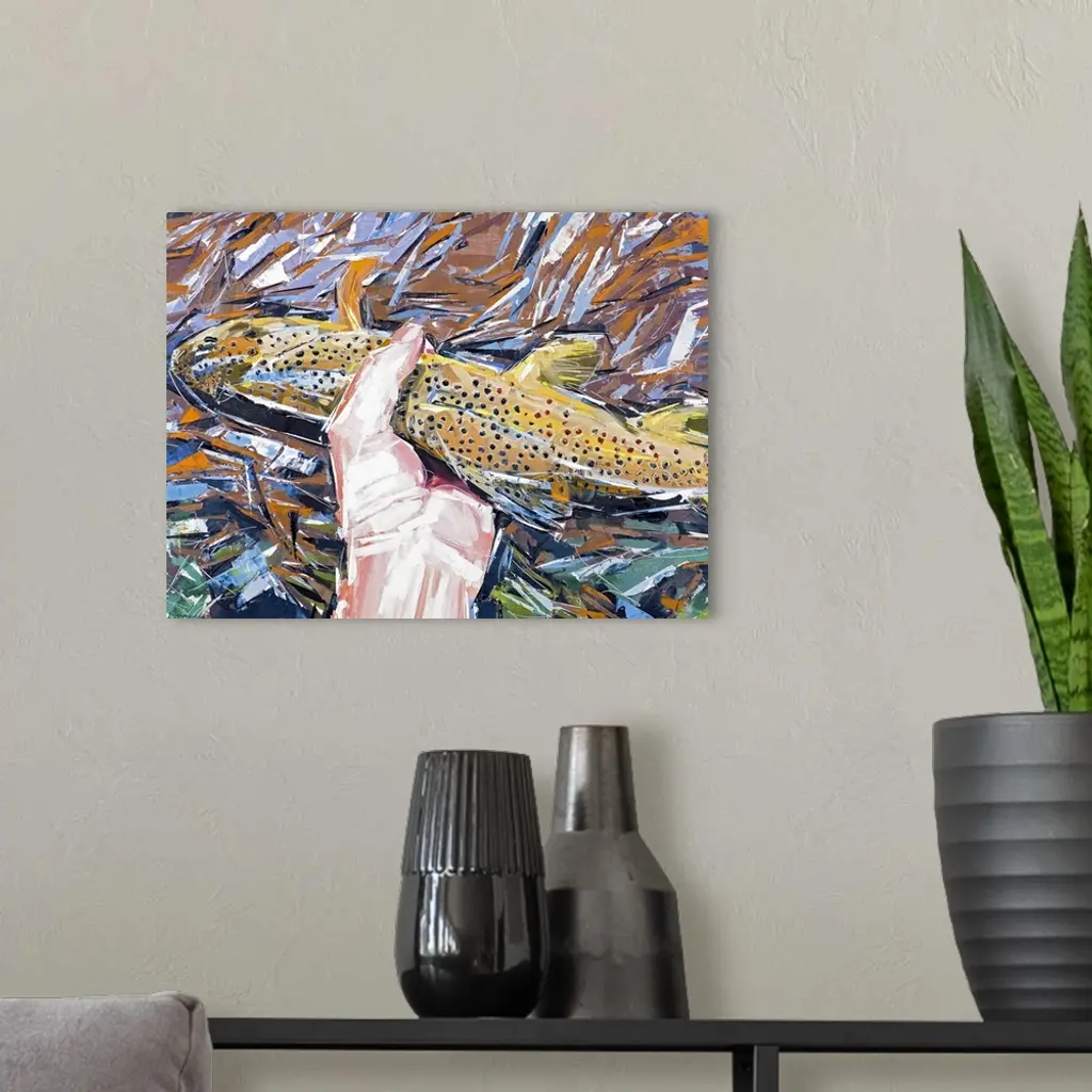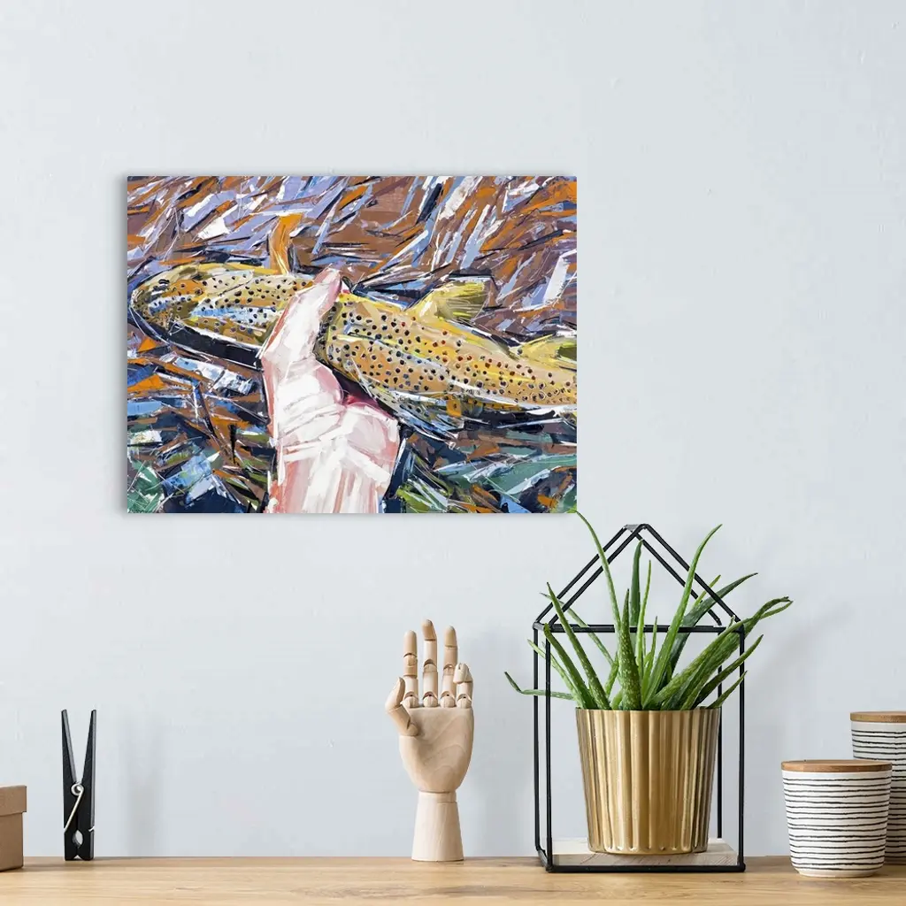 Contemporary painting of a hand holding a brown fish above a rushing stream.