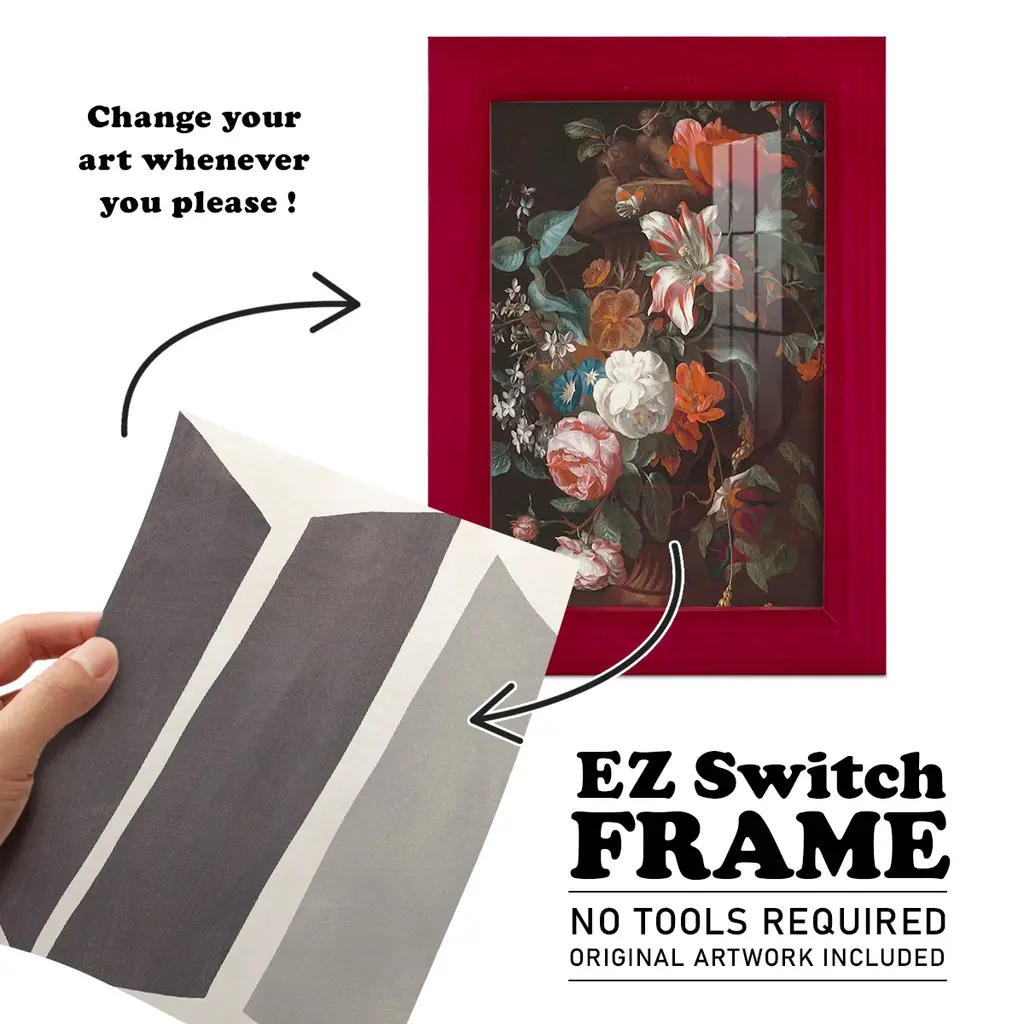 Colorblock Artifact I -EZ SWITCH Framed Print w/glass-Cherry Red A delightful, framed print. Featuring a solid wood frame with real wood glass. This premium print is giclee quality. In addition, every frame features a removable back and table top stand. This allows you to change your art in the future or to just stand the art on a table for a new look. We are sure you'll enjoy our new series of EZ SWITCH Framed Art. Solid Wood Frame Real Glass Removable / Replaceable Art Built in Tabletop Stand Sizes range from 4x6 up to 12x15 - buy just one or pair them up as sets as you see fit.