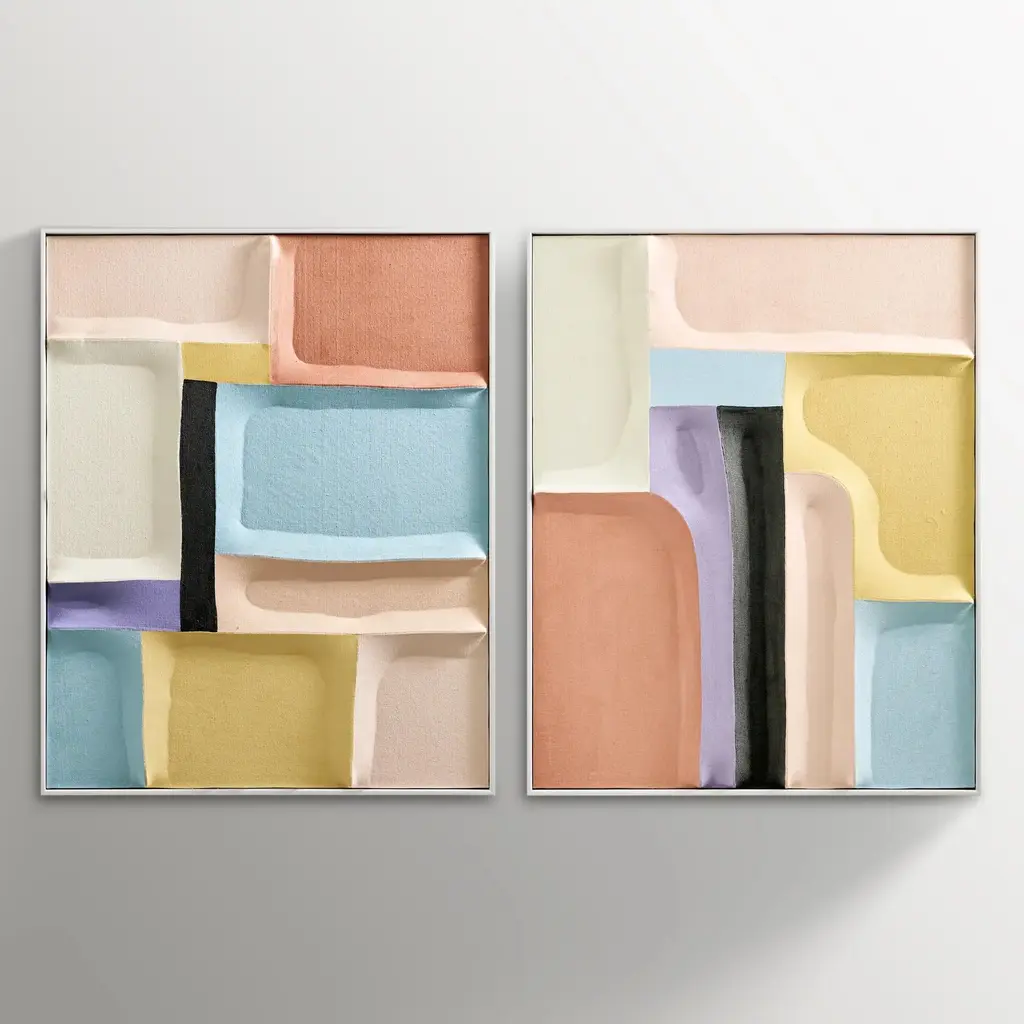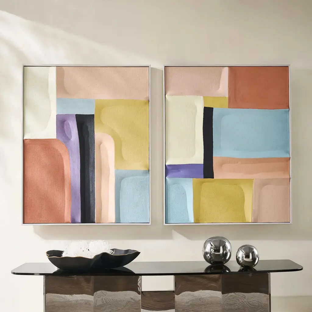 Make a bold statement with Colorblock Canvas 2. This large-scale, hand-painted artwork features eye-catching hues and geometric contrasts that command attention. Framed in a sleek white floater frame, it brings a sense of artistic dynamism to any space.
