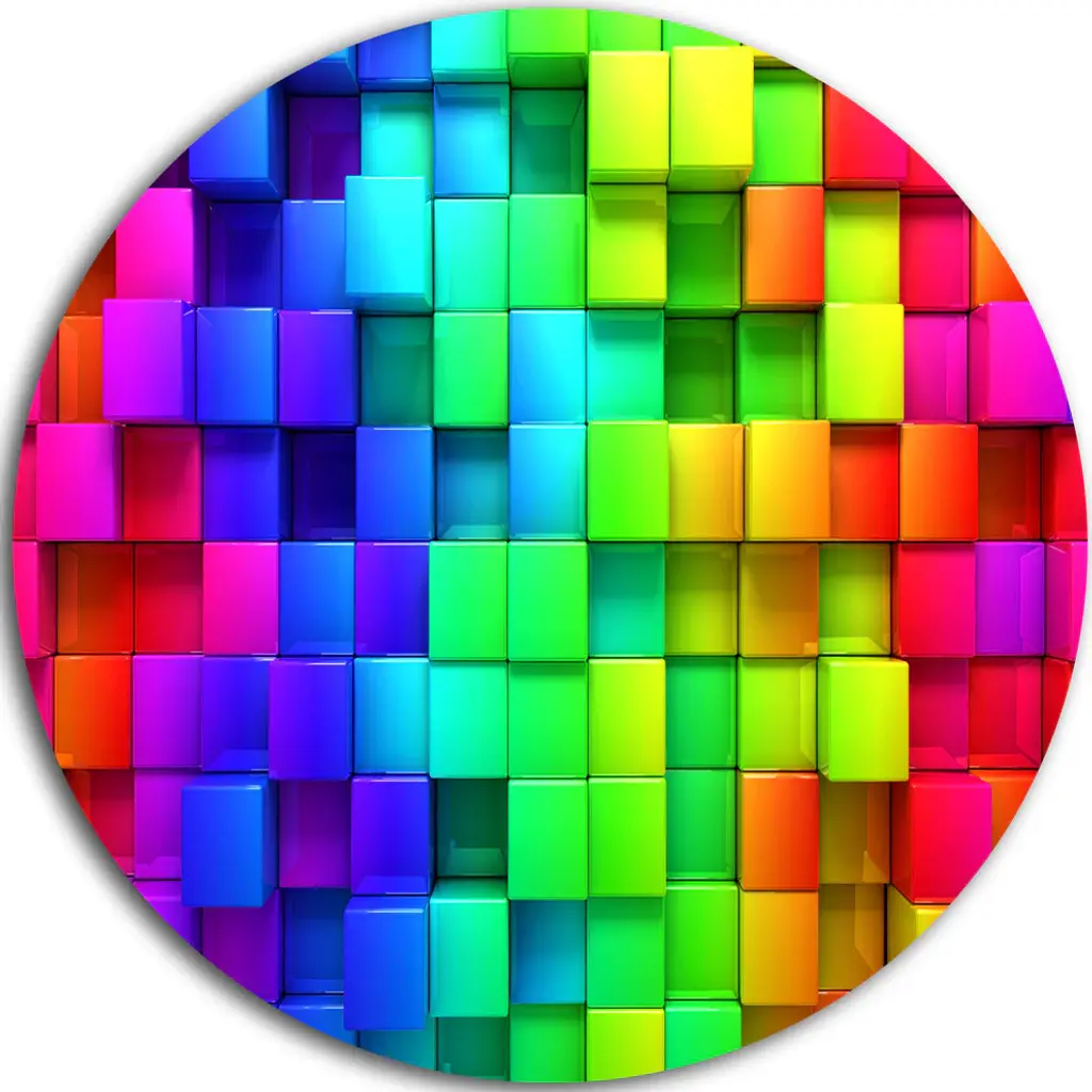 Bring Contemporary Abstraction to your home with this large Circle Metal wall art. This Colored 3D Cubes Wall Design Metal Artwork makes it the focal point of any room or office. - White Gloss Coating ensures colors are extra vibrant with light reflection.- Aluminum grade Sheet Metal with 1 inch mounting frame on the back giving the illusion that the artwork is floating on the wall..- Mounting Brackets are included along with instructions.- High Quality Digital images are created directly into a glossy aluminum panel producing a stunning and captivating print into the glossy finish of the metal.- Water, Fire and Scratch resistant HD Aluminum panels.- Looks better than any photo paper and guaranteed to last at least 20 years- Easy to clean with a microfiber cloth. Colors are far superior to regular Canvas Art. - Easy to Hang
