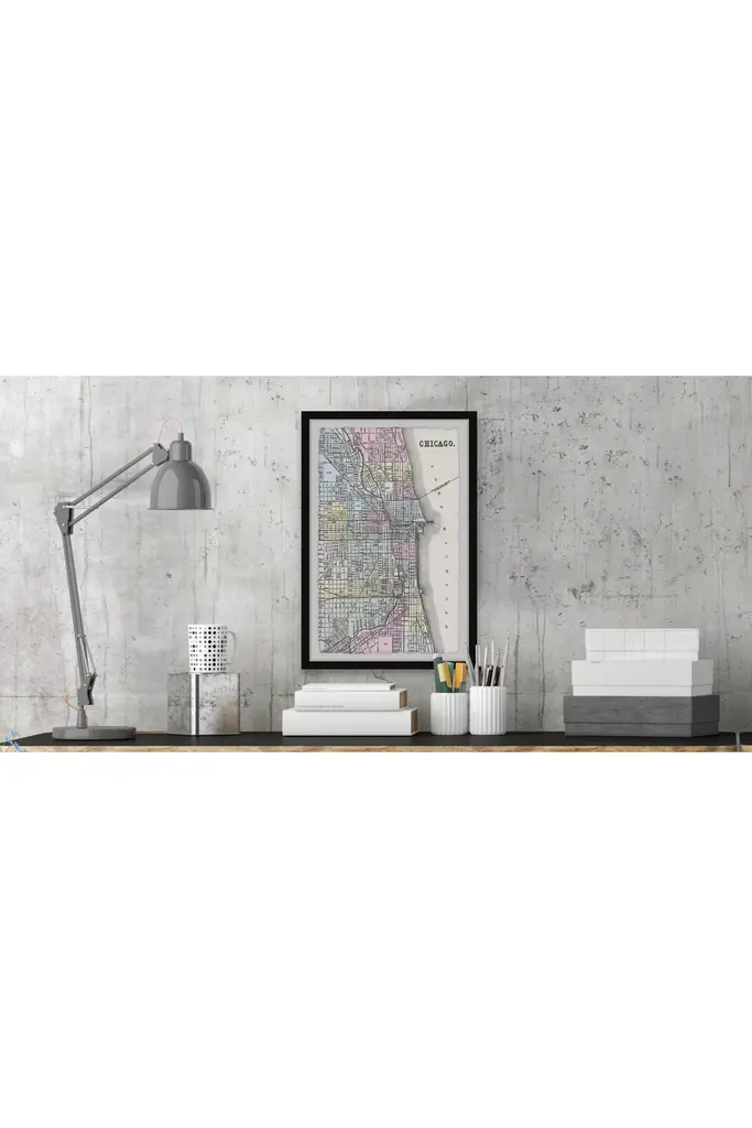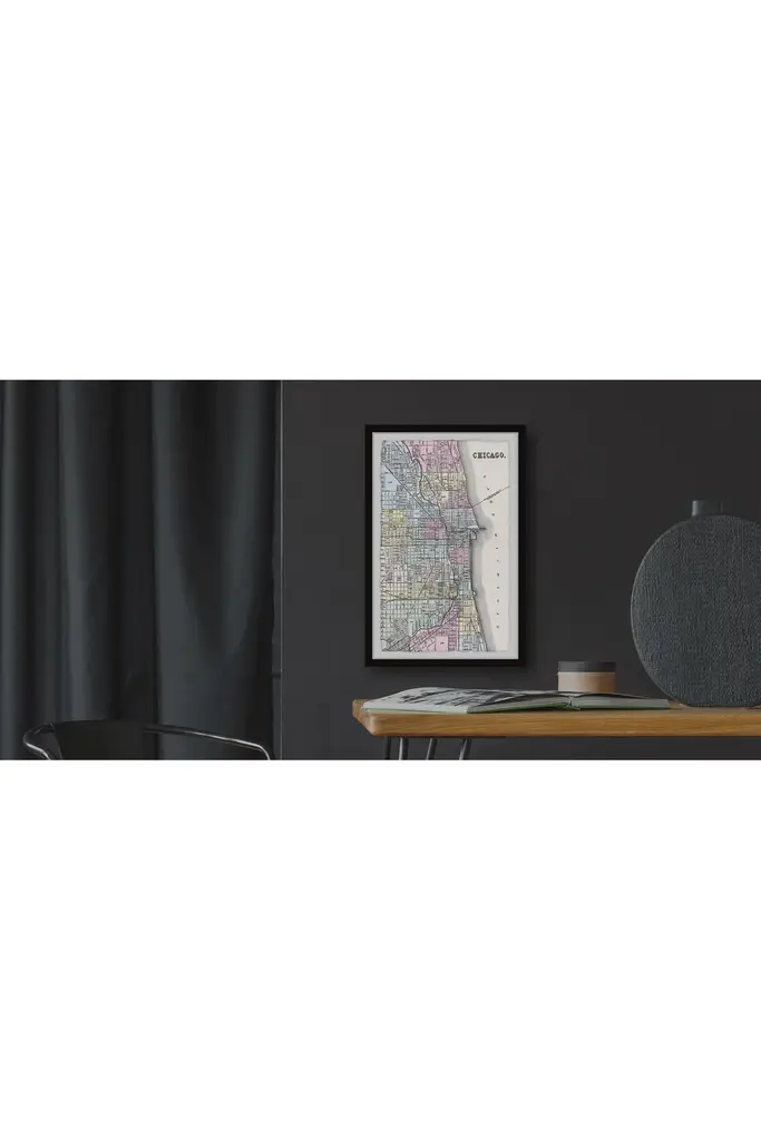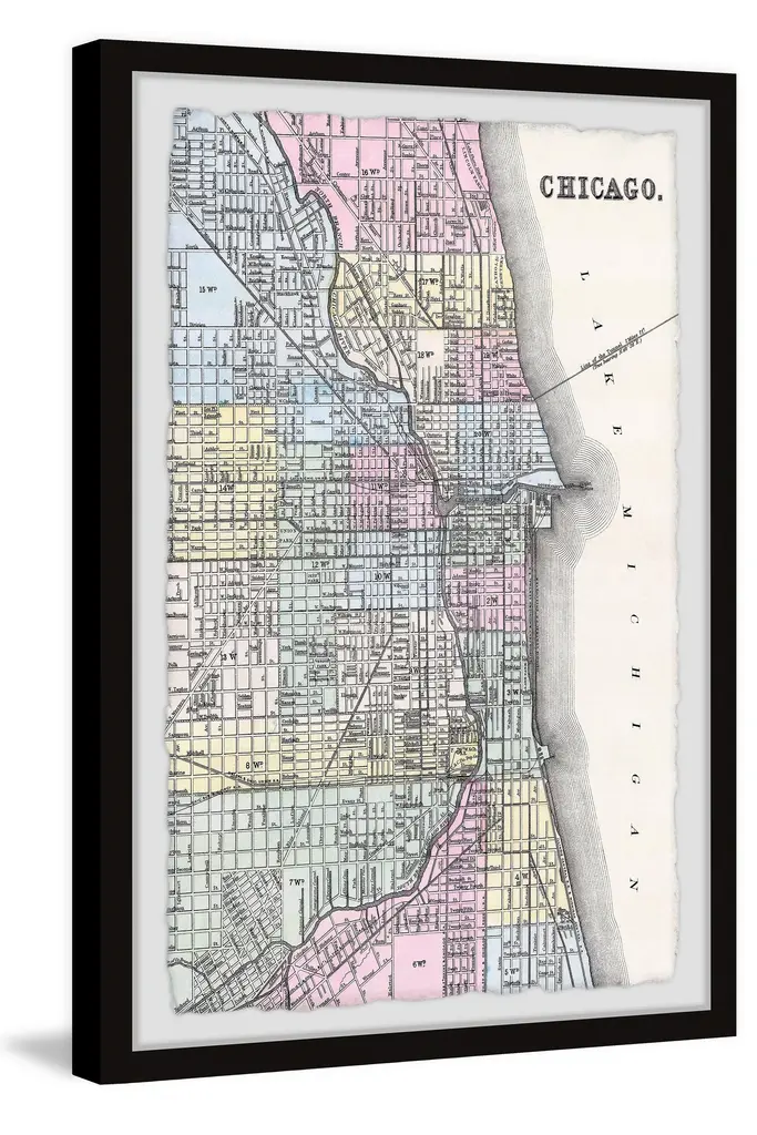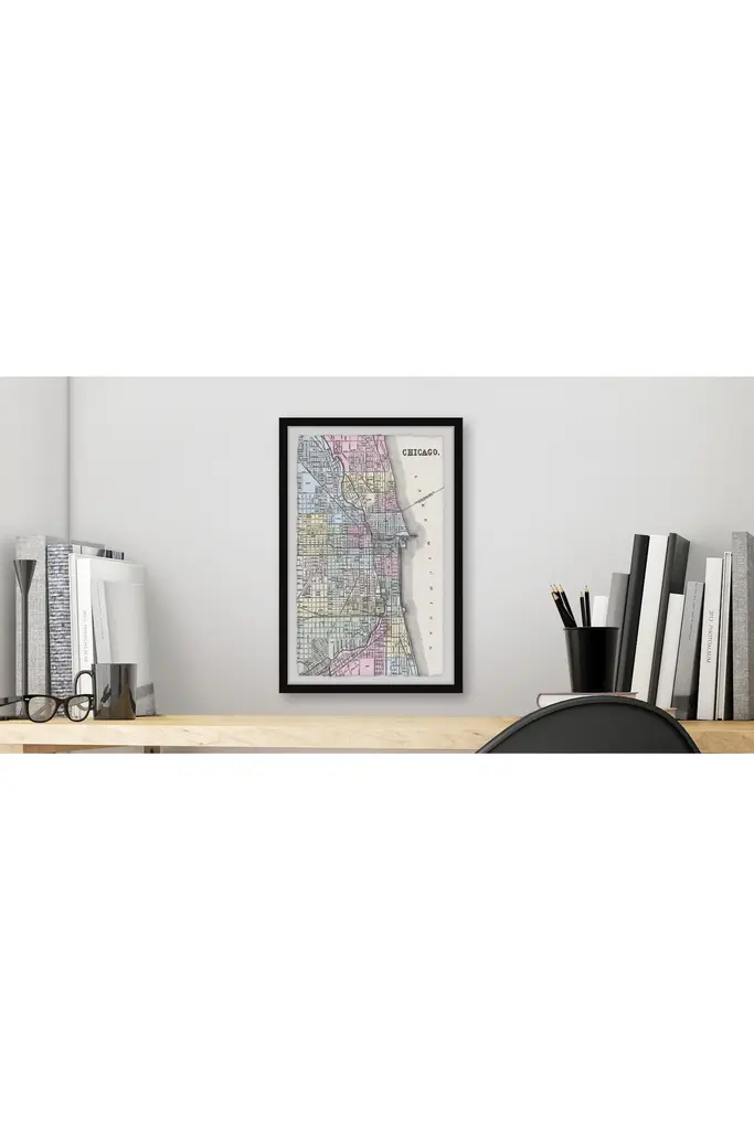A detailed map of Chicago that includes streets, Lake Michigan and more. This brightly colored piece will add a geographic aesthetic to any living space. Proudly printed in the USA, this piece is printed on high quality archive paper and professionally hand-framed. With wall-mounting hooks included, this artful accent is ready to hang up as soon as it reaches your front door.Top quality Giclee print on high resolution Archive PaperHand cut deckled edgesHigh quality durable non-warping frameFinished under high optical clarity, shatter resistant plexiglassArrives ready to hangIncludes a certificate of authenticityPrinted in the USA