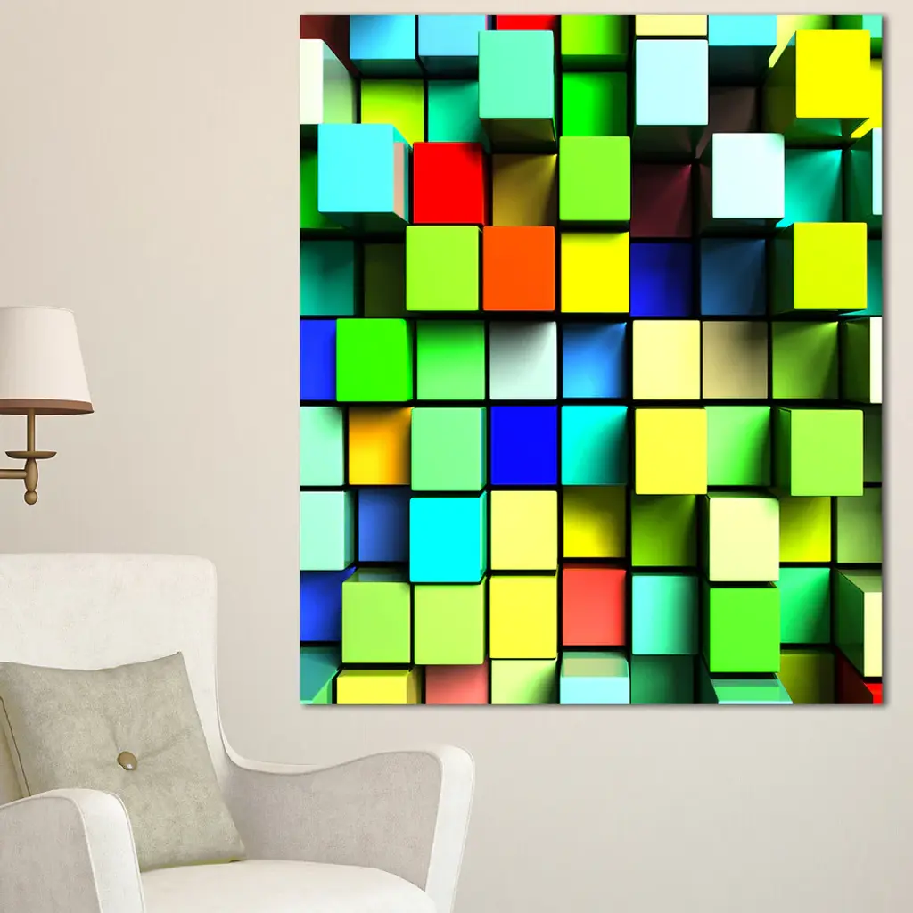The Colored 3D Cubes Wall Design canvas art print is sure to make an impression on anyone who sees it. This artwork is gallery wrapped around a 1-inch solid wood frame and arrives carefully packaged and entirely ready to hang on the wall. Design Art only uses the highest resolution and pigments to ensure a crisp colorful print that is never faded or pixelated. This artwork is sure to be a conversation starter in any home or office.