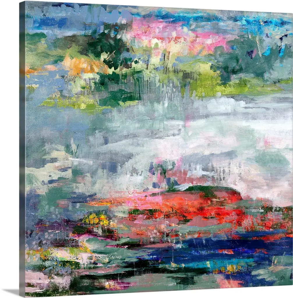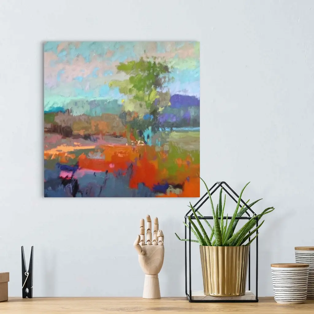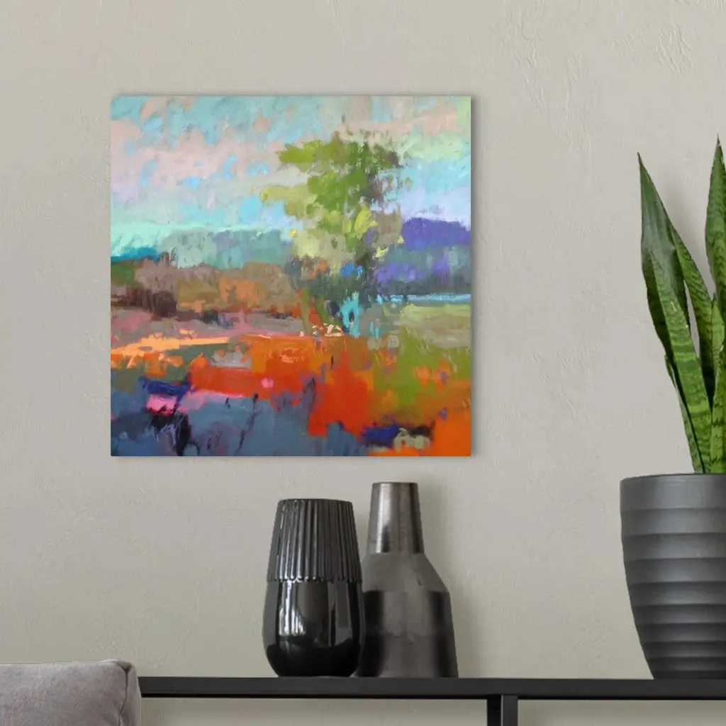 A contemporary abstract painting using vibrant colors resembling a countryside landscape.