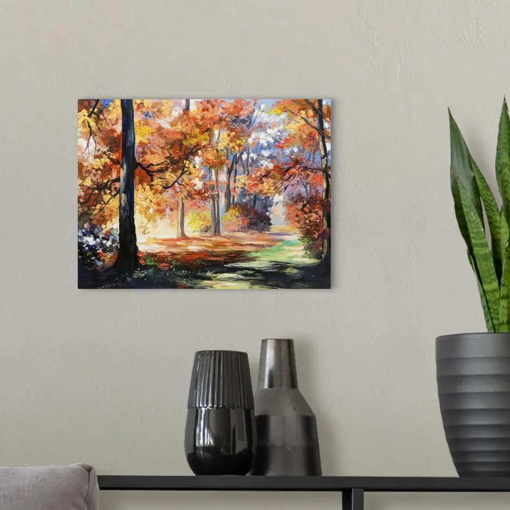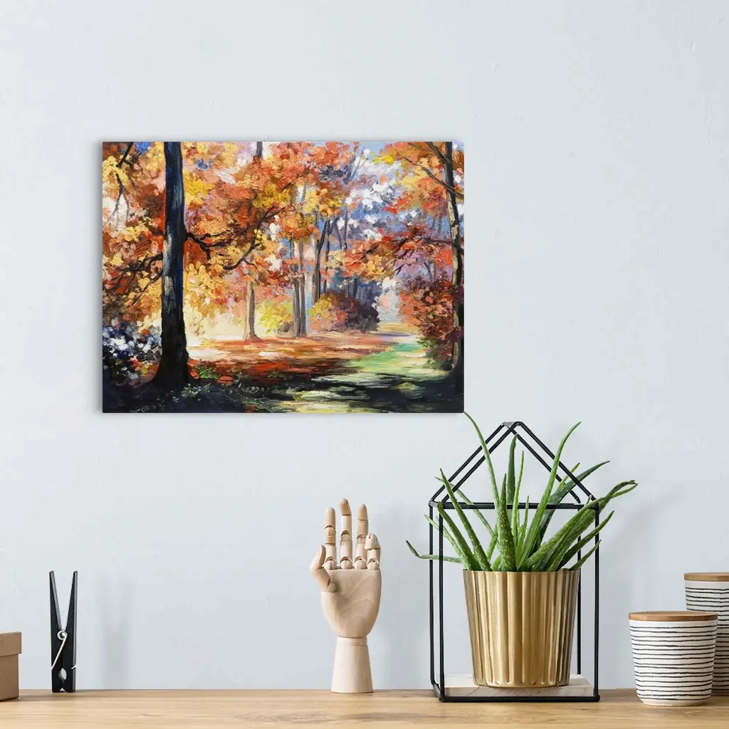 Originally an oil painting landscape of a colorful autumn forest, beautiful river.