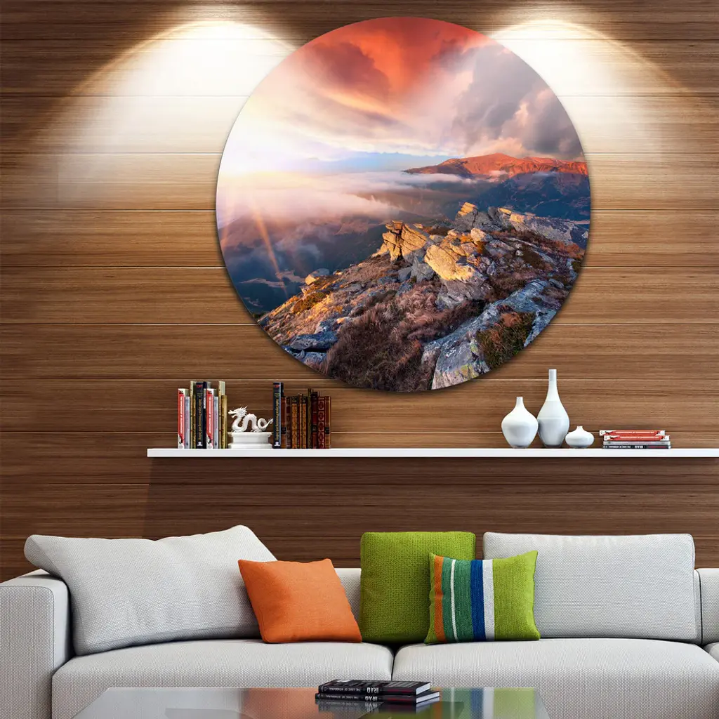 Bring Contemporary Abstraction to your home with this large Circle Metal wall art. This Colorful Autumn Sky and Mountains Metal Artwork makes it the focal point of any room or office. - White Gloss Coating ensures colors are extra vibrant with light reflection.- Aluminum grade Sheet Metal with 1 inch mounting frame on the back giving the illusion that the artwork is floating on the wall..- Mounting Brackets are included along with instructions.- High Quality Digital images are created directly into a glossy aluminum panel producing a stunning and captivating print into the glossy finish of the metal.- Water, Fire and Scratch resistant HD Aluminum panels.- Looks better than any photo paper and guaranteed to last at least 20 years- Easy to clean with a microfiber cloth. Colors are far superior to regular Canvas Art. - Easy to Hang