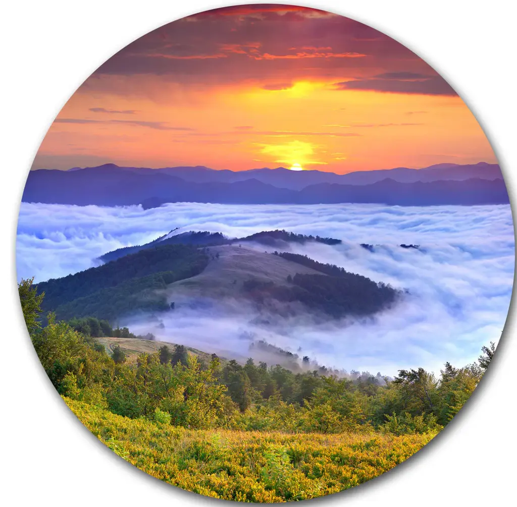 Bring Contemporary Abstraction to your home with this large Circle Metal wall art. This Colorful Clouds and Foggy Hills Metal Artwork makes it the focal point of any room or office. - White Gloss Coating ensures colors are extra vibrant with light reflection.- Aluminum grade Sheet Metal with 1 inch mounting frame on the back giving the illusion that the artwork is floating on the wall..- Mounting Brackets are included along with instructions.- High Quality Digital images are created directly into a glossy aluminum panel producing a stunning and captivating print into the glossy finish of the metal.- Water, Fire and Scratch resistant HD Aluminum panels.- Looks better than any photo paper and guaranteed to last at least 20 years- Easy to clean with a microfiber cloth. Colors are far superior to regular Canvas Art. - Easy to Hang