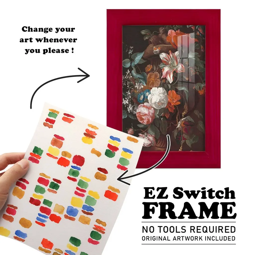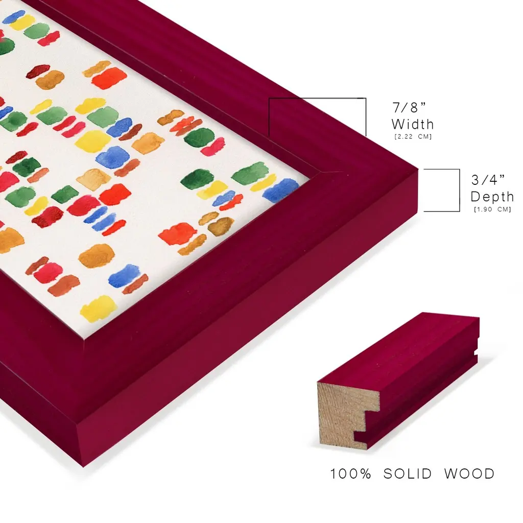 Colorful Code I -EZ SWITCH Framed Print w/glass-Cherry Red A delightful, framed print. Featuring a solid wood frame with real wood glass. This premium print is giclee quality. In addition, every frame features a removable back and table top stand. This allows you to change your art in the future or to just stand the art on a table for a new look. We are sure you'll enjoy our new series of EZ SWITCH Framed Art. Solid Wood Frame Real Glass Removable / Replaceable Art Built in Tabletop Stand Sizes range from 4x6 up to 12x15 - buy just one or pair them up as sets as you see fit.