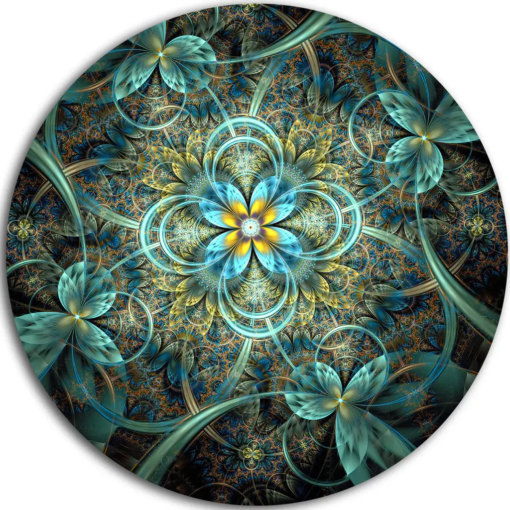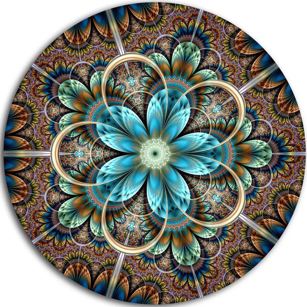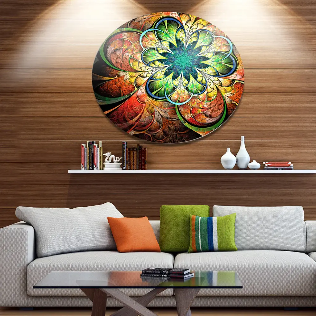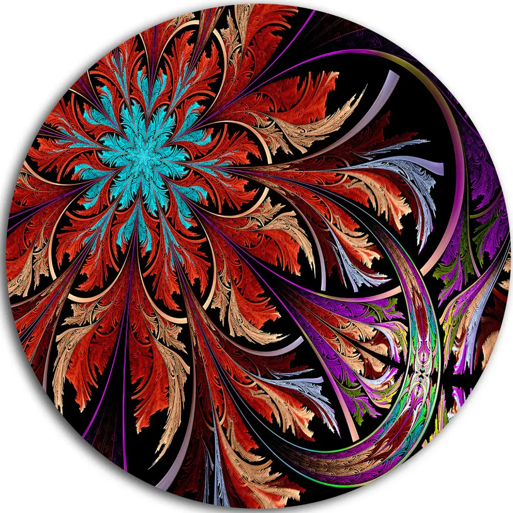 Bring Contemporary Abstraction to your home with this large Circle Metal wall art. This Colorful Fractal Flower Pattern Metal Artwork makes it the focal point of any room or office. - White Gloss Coating ensures colors are extra vibrant with light reflection.- Aluminum grade Sheet Metal with 1 inch mounting frame on the back giving the illusion that the artwork is floating on the wall..- Mounting Brackets are included along with instructions.- High Quality Digital images are created directly into a glossy aluminum panel producing a stunning and captivating print into the glossy finish of the metal.- Water, Fire and Scratch resistant HD Aluminum panels.- Looks better than any photo paper and guaranteed to last at least 20 years- Easy to clean with a microfiber cloth. Colors are far superior to regular Canvas Art. - Easy to Hang
