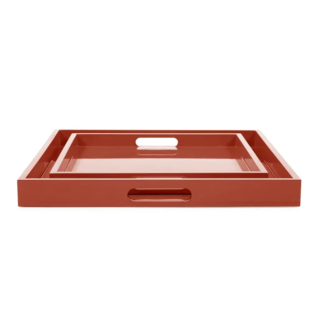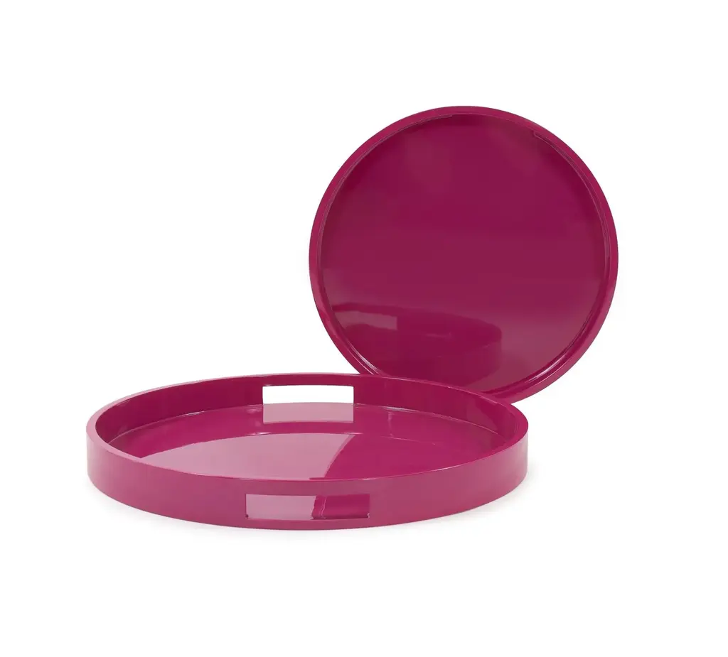 The Colorful Fushia Tray Set - Set of 2 As soon as summer arrives, with it's warm breezes and bright sunny days, the beaches along the Mediterranean blossom with vibrant colors. From beach attire to accessories, everyone celebrates with a colorful display of casual coastal living. Our set of 2 square Saint Tropez trays in a beautiful Fushia color. These lacquered double handled wooden trays are hand crafted and finished by skilled artisans. Each of these trays will become not only your favorite accessory for the summer but year round as they add that pop of color to any special occasion. Dimensions: Large 2H x 19.5/8W x 19.5/8D - Small: 15.3/4D x 1.5H x15.3/4W Antique, vintage, designer floor samples & new products from one of the hottest Retail and To The Trade Home Furnishings showrooms in the country. Located in Chicago's chic Roscoe Village, Kenneth Ludwig Chicago carries the best offerings in furniture, accessories, artwork & textiles. Offerings are always fresh & always inspiring! Quite often ( due to a discontinued style, fabric or frame ) they must sell off their showroom floor samples. You receive first quality pieces at amazing prices. Check back weekly for new inventory added. less