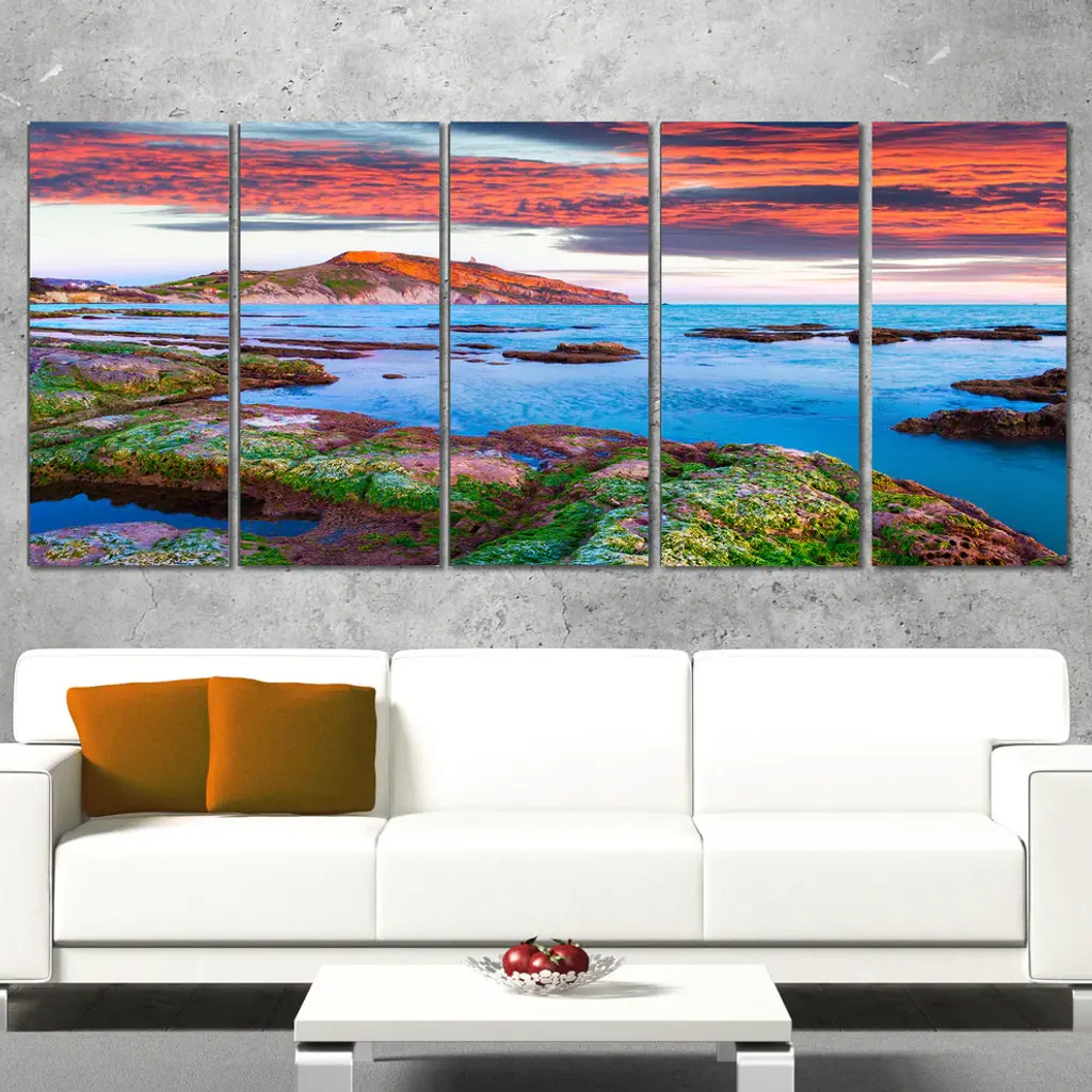 "Colorful Giollonardo Beach Sunset" Modern Seashore Wall Art, 5 Panels, 60"x28"