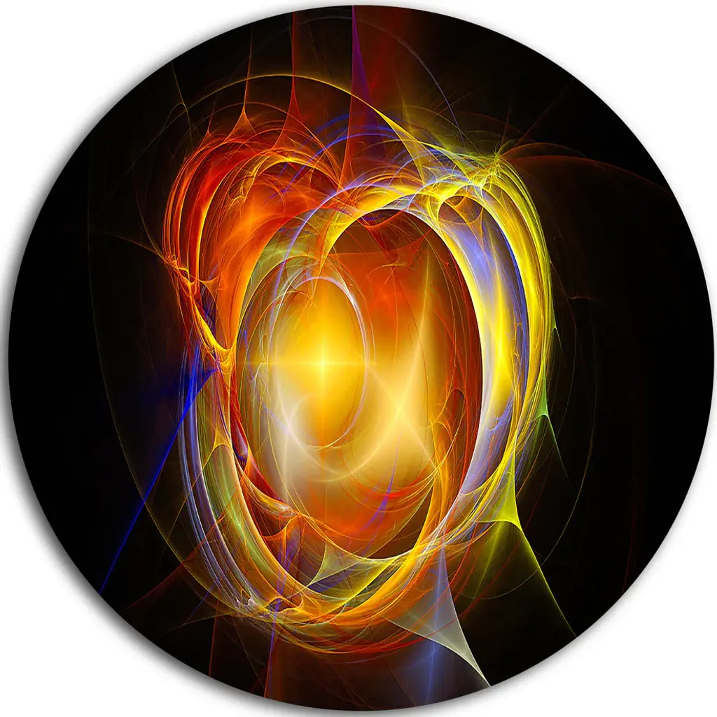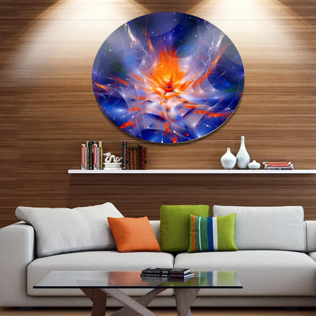Bring Contemporary Abstraction to your home with this large Circle Metal wall art. This Colorful Glowing Space Flower Fractal Metal Artwork makes it the focal point of any room or office. - White Gloss Coating ensures colors are extra vibrant with light reflection.- Aluminum grade Sheet Metal with 1 inch mounting frame on the back giving the illusion that the artwork is floating on the wall..- Mounting Brackets are included along with instructions.- High Quality Digital images are created directly into a glossy aluminum panel producing a stunning and captivating print into the glossy finish of the metal.- Water, Fire and Scratch resistant HD Aluminum panels.- Looks better than any photo paper and guaranteed to last at least 20 years- Easy to clean with a microfiber cloth. Colors are far superior to regular Canvas Art. - Easy to Hang