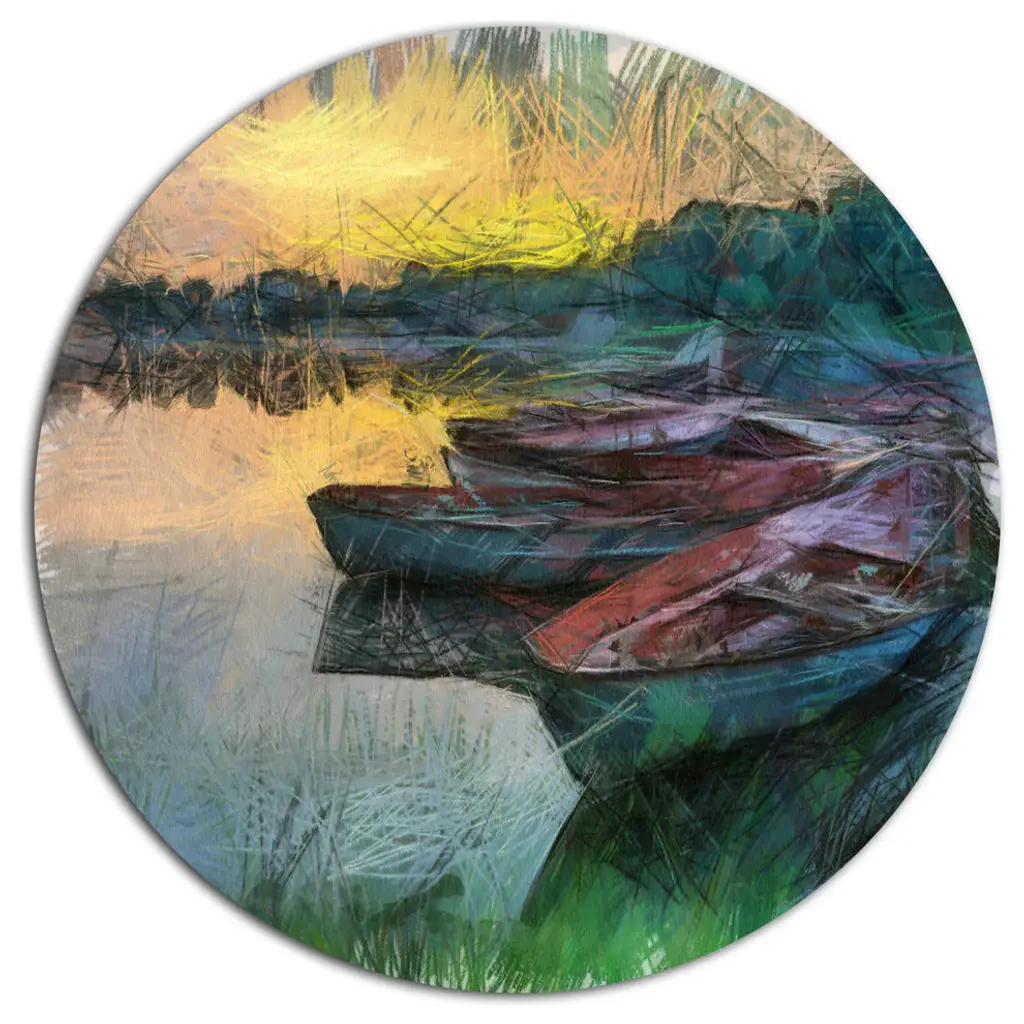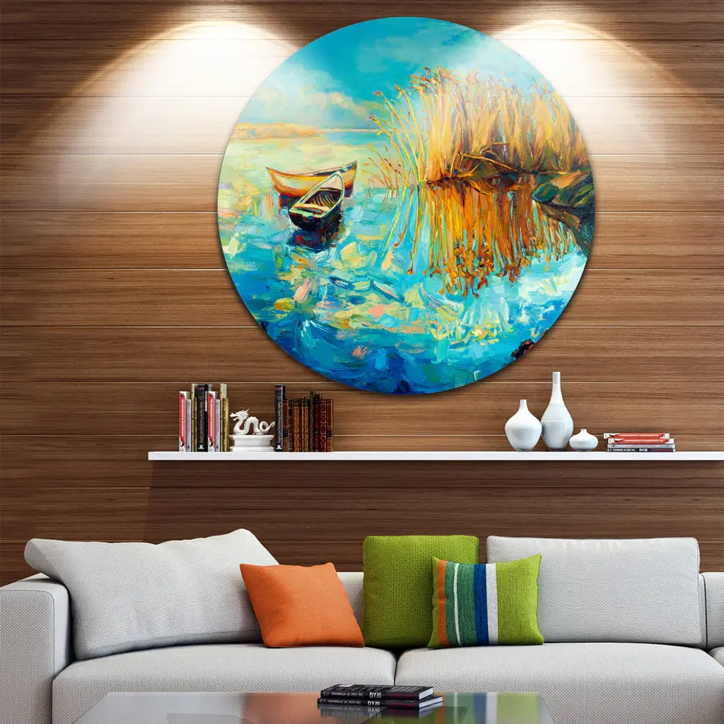 Colorful Lake With Boats, Seascape Painting Disc Metal Wall Art, 38"