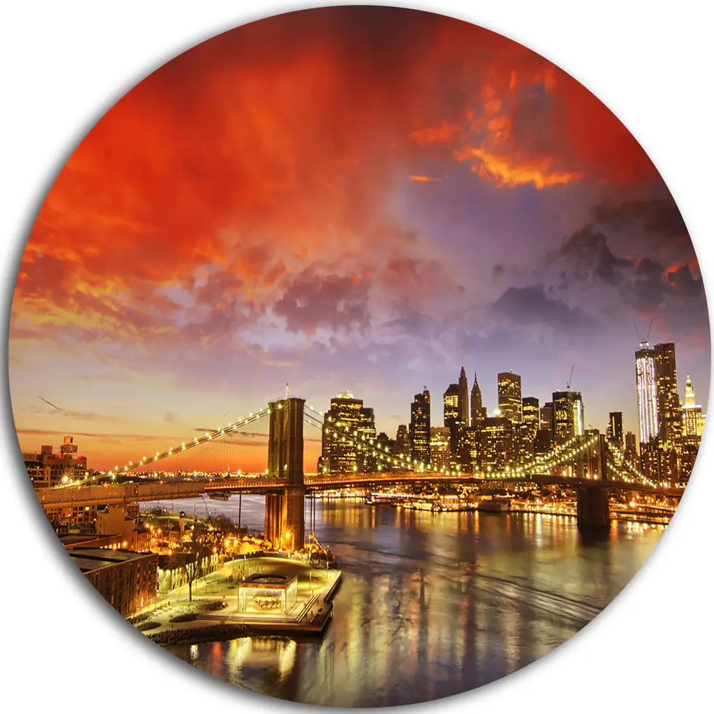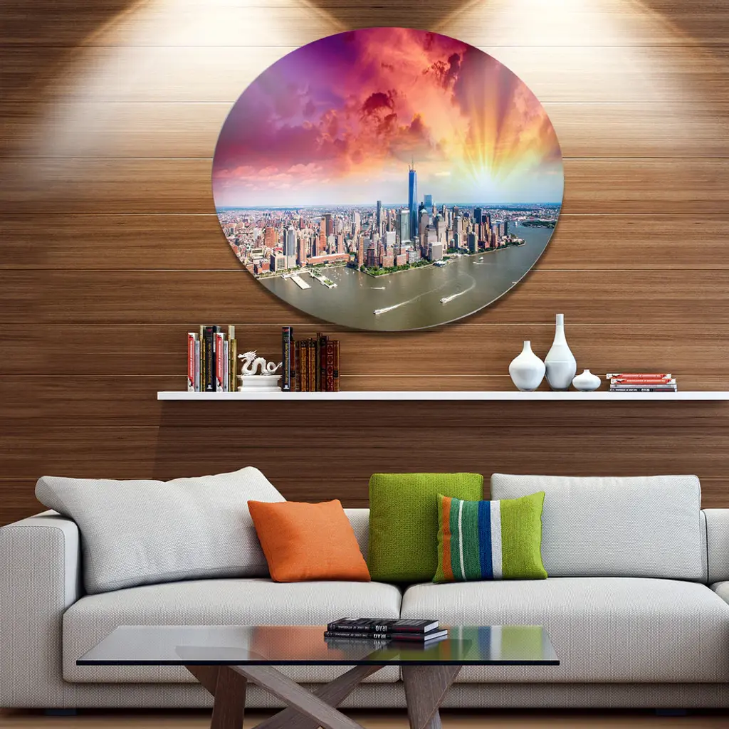 Colorful New York Skyline Aerial View, Cityscape Disc Metal Art, 23"