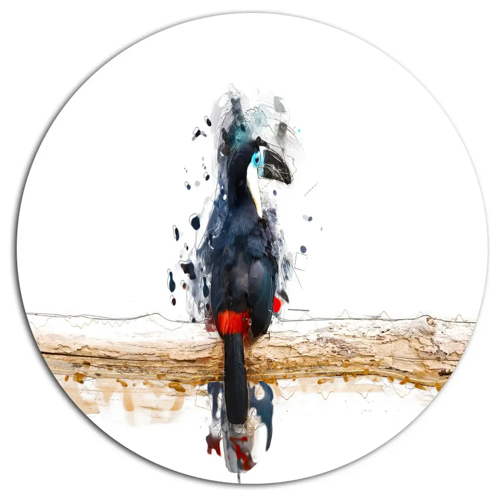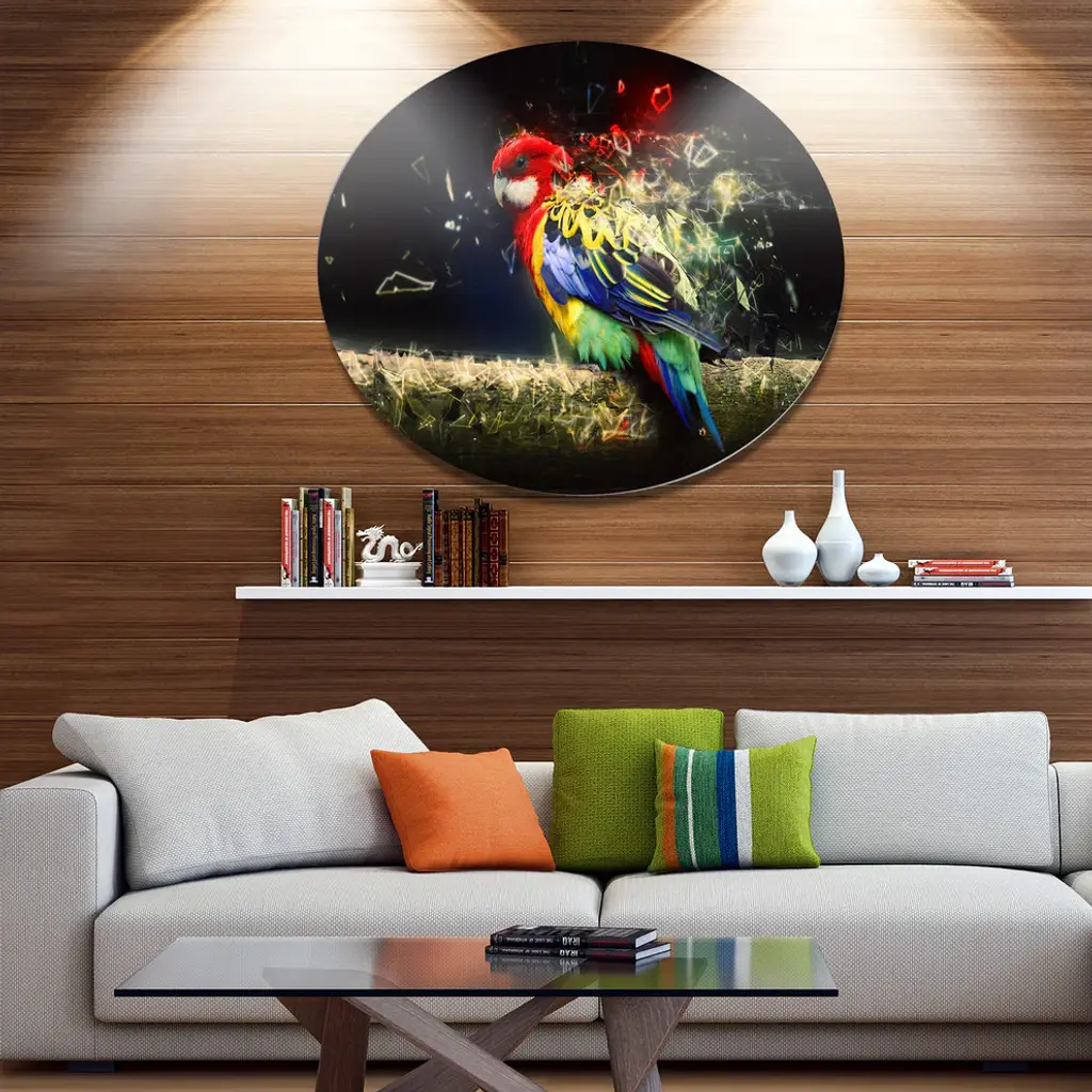 Bring Contemporary Abstraction to your home with this large Circle Metal wall art. This Colorful Parrot on Branch Metal Artwork makes it the focal point of any room or office. - White Gloss Coating ensures colors are extra vibrant with light reflection.- Aluminum grade Sheet Metal with 1 inch mounting frame on the back giving the illusion that the artwork is floating on the wall..- Mounting Brackets are included along with instructions.- High Quality Digital images are created directly into a glossy aluminum panel producing a stunning and captivating print into the glossy finish of the metal.- Water, Fire and Scratch resistant HD Aluminum panels.- Looks better than any photo paper and guaranteed to last at least 20 years- Easy to clean with a microfiber cloth. Colors are far superior to regular Canvas Art. - Easy to Hang