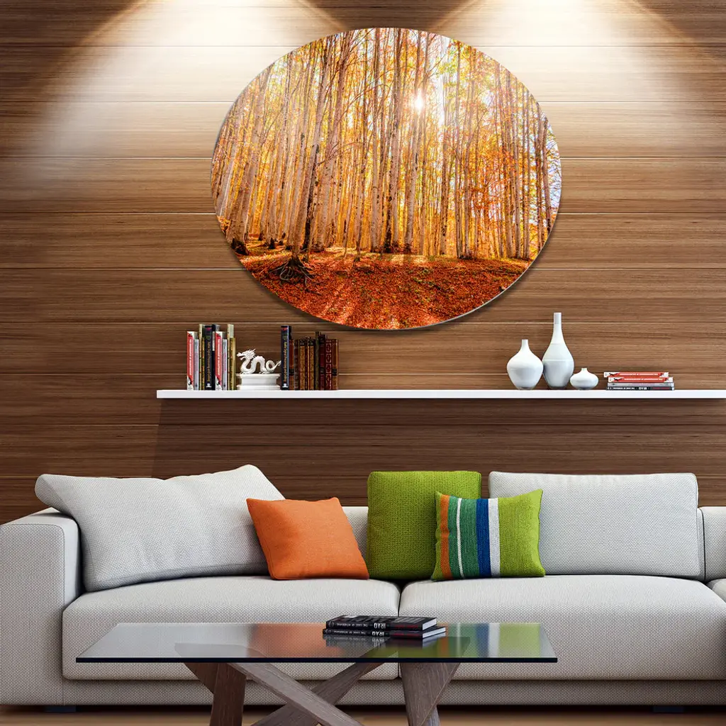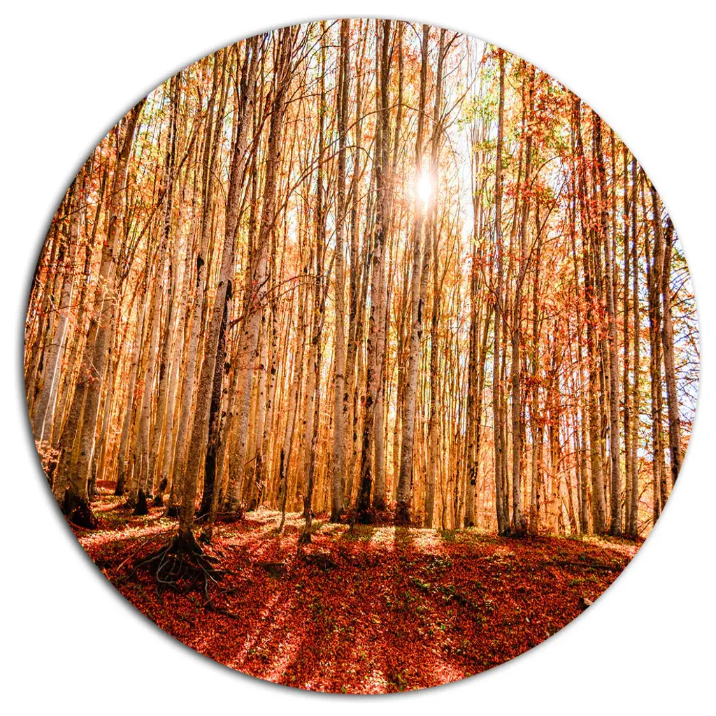 Bring Contemporary Abstraction to your home with this large Circle Metal wall art. This Colorful Red Forest at Sunset Metal Artwork makes it the focal point of any room or office. - White Gloss Coating ensures colors are extra vibrant with light reflection.- Aluminum grade Sheet Metal with 1 inch mounting frame on the back giving the illusion that the artwork is floating on the wall..- Mounting Brackets are included along with instructions.- High Quality Digital images are created directly into a glossy aluminum panel producing a stunning and captivating print into the glossy finish of the metal.- Water, Fire and Scratch resistant HD Aluminum panels.- Looks better than any photo paper and guaranteed to last at least 20 years- Easy to clean with a microfiber cloth. Colors are far superior to regular Canvas Art. - Easy to Hang