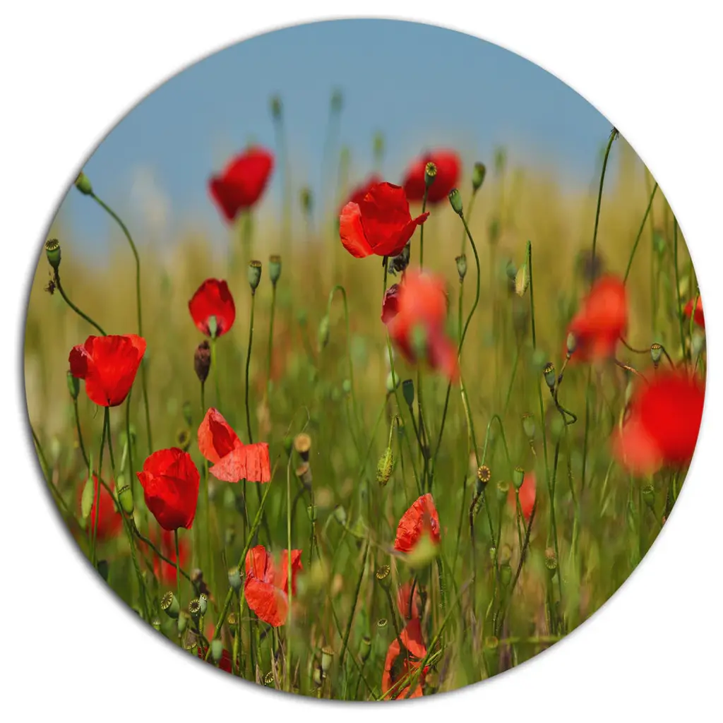 Bring Contemporary Abstraction to your home with this large Circle Metal wall art. This Colorful Red Poppy Flower Field Metal Artwork makes it the focal point of any room or office. - White Gloss Coating ensures colors are extra vibrant with light reflection.- Aluminum grade Sheet Metal with 1 inch mounting frame on the back giving the illusion that the artwork is floating on the wall..- Mounting Brackets are included along with instructions.- High Quality Digital images are created directly into a glossy aluminum panel producing a stunning and captivating print into the glossy finish of the metal.- Water, Fire and Scratch resistant HD Aluminum panels.- Looks better than any photo paper and guaranteed to last at least 20 years- Easy to clean with a microfiber cloth. Colors are far superior to regular Canvas Art. - Easy to Hang