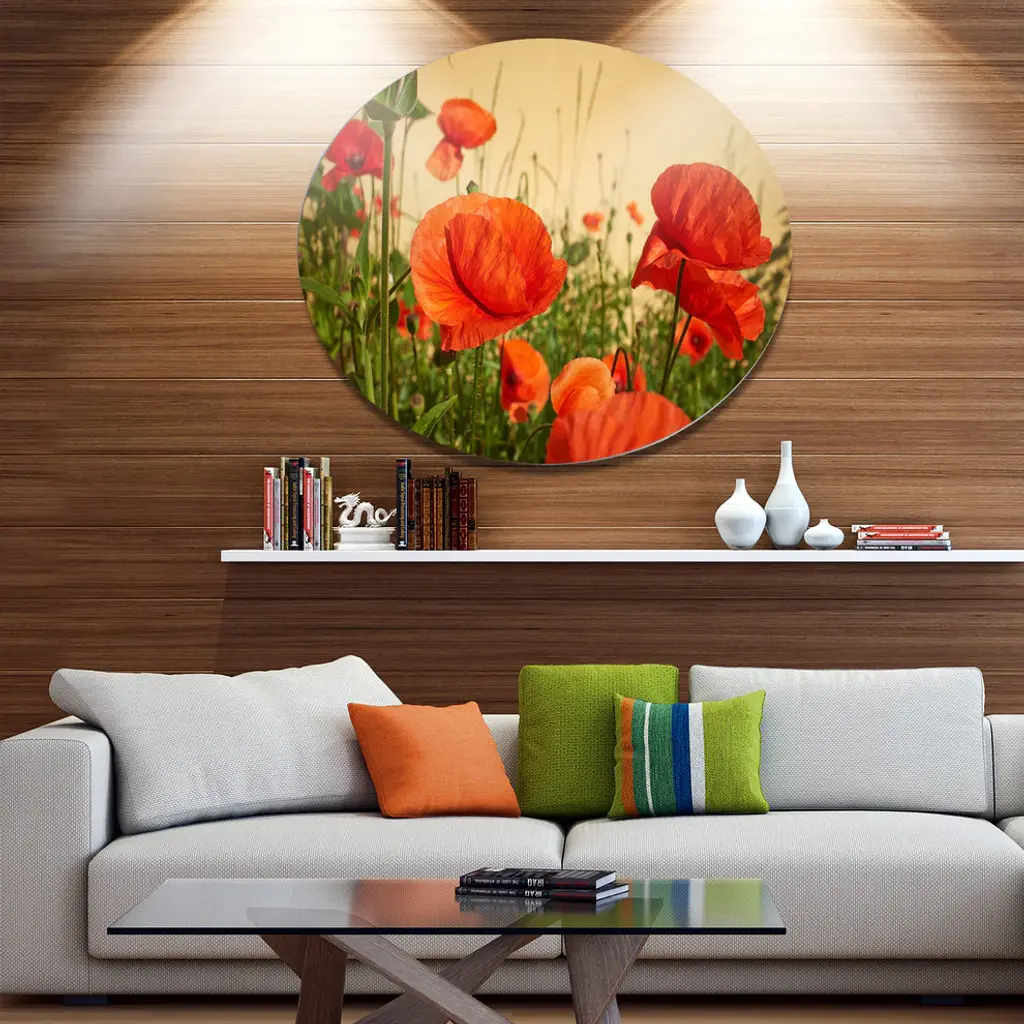 Colorful Red Poppy Flower Field, Flower Disc Metal Artwork, 23"