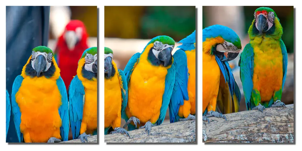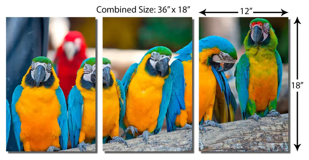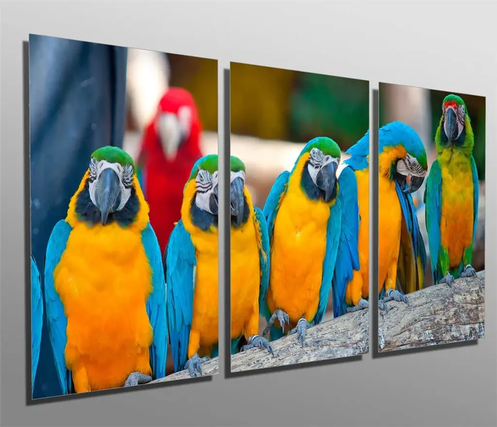 36"œ x 18"œ total size. Ready To Hang! (3 pieces - 12"œ x 18"œ each). 3 Panel Split (Triptych) Metal Print featuring colorful Scarlet Macaws, parrots sitting on a branch. Modern metal wall art for home or office wall decor & interior design. Printed on Luxurious, HD aluminum glossy metal panels. Multi panel art.. HD aluminum panels. Metal print wall art. Includes Shadow Wall Mount on the back.• Aluminum Metal Wall Art• Made in USA• Ready to hang - No assembly required• Shadow mount hardware on the back• 0.045"œ thick HD Aluminum Panels• Scratch resistant, glossy finish• Superb color clarity, luxurious prints• Epson printing process• For indoor or moisture rich environment use• Easy to clean. Gently wipe with microfiber cloth.