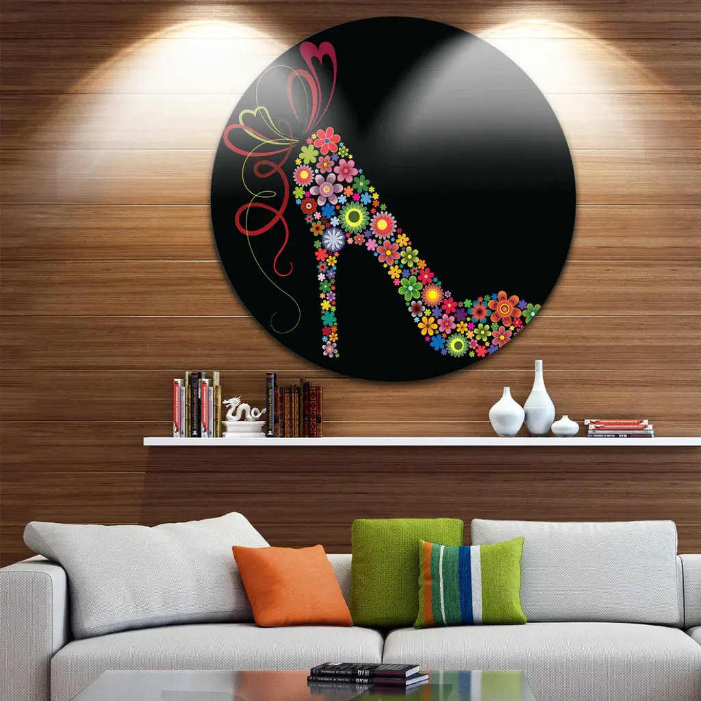 Bring Contemporary Abstraction to your home with this large Circle Metal wall art. This Colorful Shoe with a Bow Metal Artwork makes it the focal point of any room or office. - White Gloss Coating ensures colors are extra vibrant with light reflection.- Aluminum grade Sheet Metal with 1 inch mounting frame on the back giving the illusion that the artwork is floating on the wall..- Mounting Brackets are included along with instructions.- High Quality Digital images are created directly into a glossy aluminum panel producing a stunning and captivating print into the glossy finish of the metal.- Water, Fire and Scratch resistant HD Aluminum panels.- Looks better than any photo paper and guaranteed to last at least 20 years- Easy to clean with a microfiber cloth. Colors are far superior to regular Canvas Art. - Easy to Hang