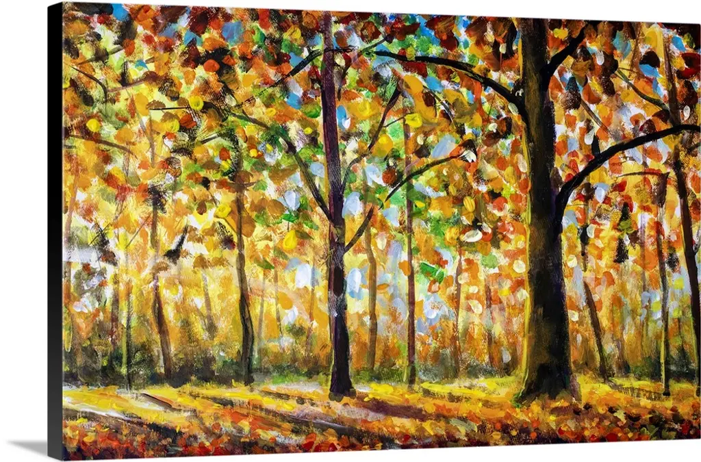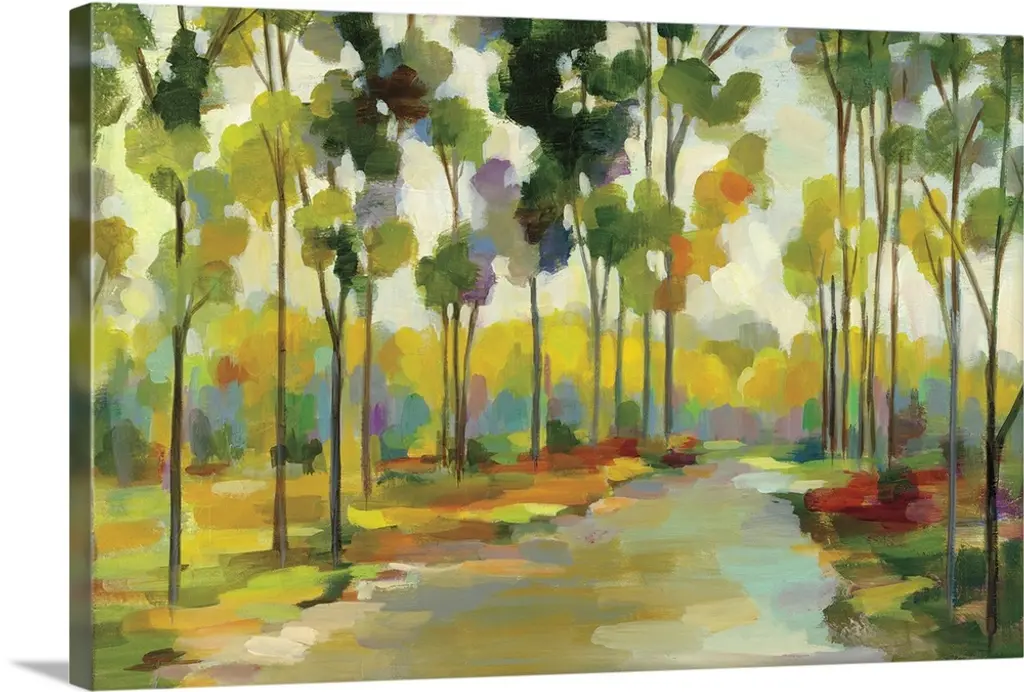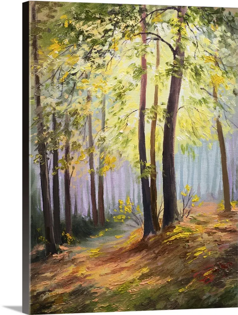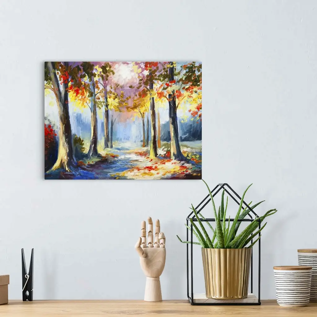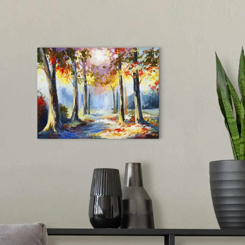 Originally an oil painting of a colorful spring landscape, road in the forest.