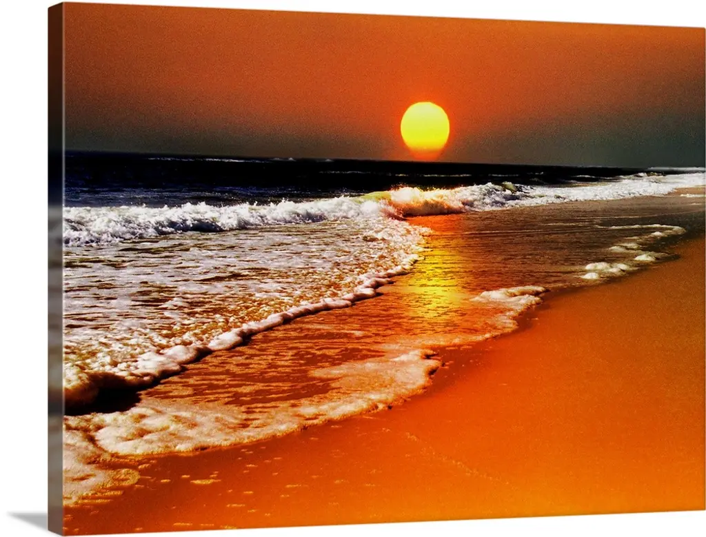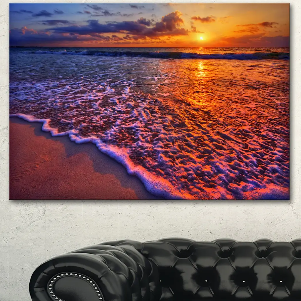 Colorful Sunset And Wavy Waters, Seashore Canvas Art Print, 60"x28"
