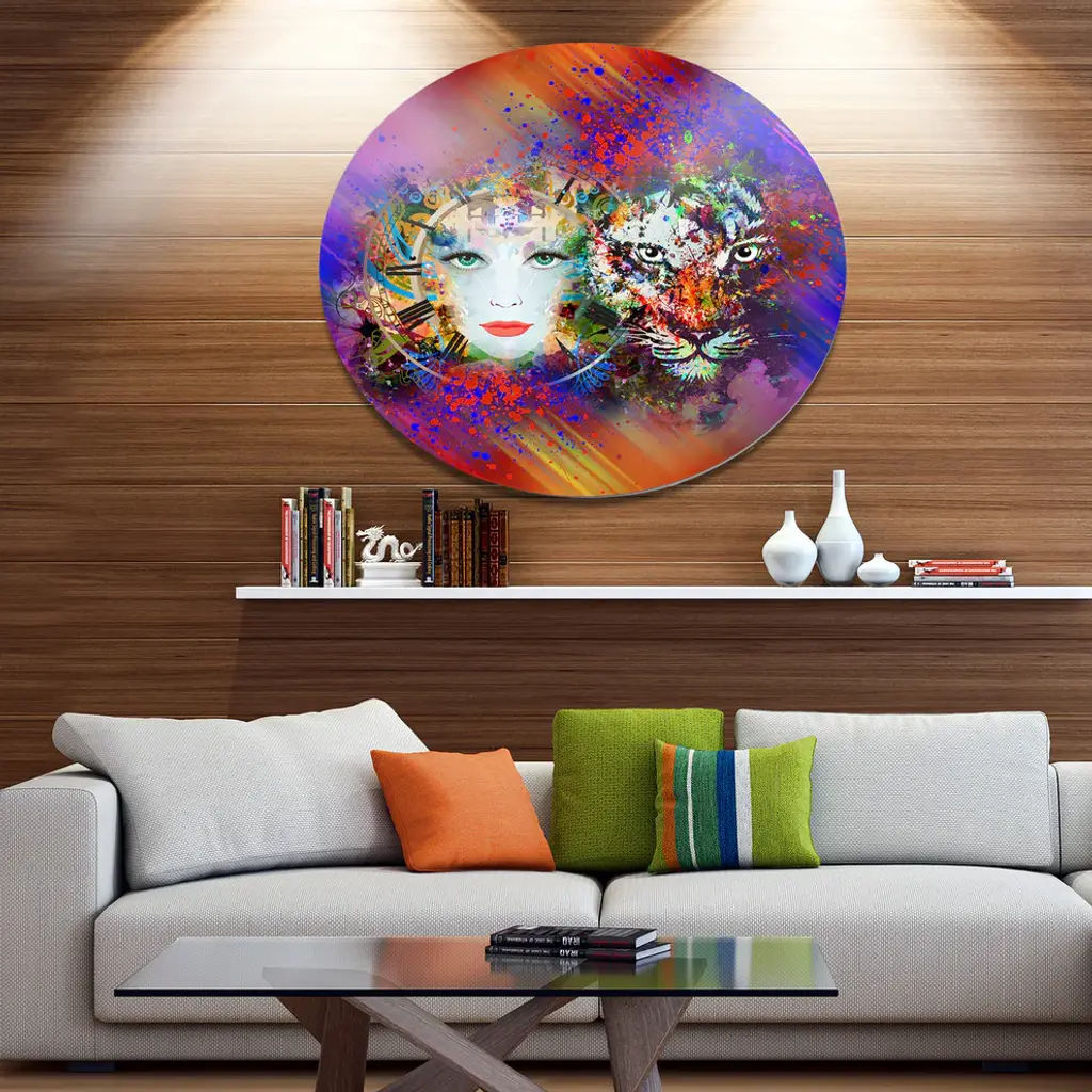 Bring Contemporary Abstraction to your home with this large Circle Metal wall art. This Colorful Tiger and Woman Face Metal Artwork makes it the focal point of any room or office. - White Gloss Coating ensures colors are extra vibrant with light reflection.- Aluminum grade Sheet Metal with 1 inch mounting frame on the back giving the illusion that the artwork is floating on the wall..- Mounting Brackets are included along with instructions.- High Quality Digital images are created directly into a glossy aluminum panel producing a stunning and captivating print into the glossy finish of the metal.- Water, Fire and Scratch resistant HD Aluminum panels.- Looks better than any photo paper and guaranteed to last at least 20 years- Easy to clean with a microfiber cloth. Colors are far superior to regular Canvas Art. - Easy to Hang