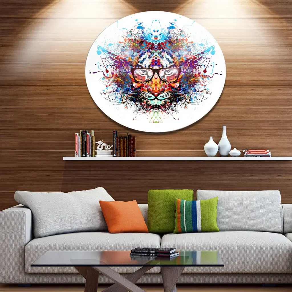 Bring Contemporary Abstraction to your home with this large Circle Metal wall art. This Colorful Tiger in Glasses Metal Artwork makes it the focal point of any room or office. - White Gloss Coating ensures colors are extra vibrant with light reflection.- Aluminum grade Sheet Metal with 1 inch mounting frame on the back giving the illusion that the artwork is floating on the wall..- Mounting Brackets are included along with instructions.- High Quality Digital images are created directly into a glossy aluminum panel producing a stunning and captivating print into the glossy finish of the metal.- Water, Fire and Scratch resistant HD Aluminum panels.- Looks better than any photo paper and guaranteed to last at least 20 years- Easy to clean with a microfiber cloth. Colors are far superior to regular Canvas Art. - Easy to Hang