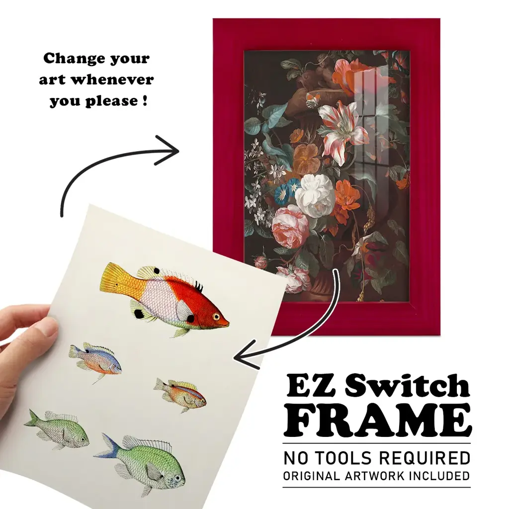 Colorful Tropical Fish I -EZ SWITCH Framed Print w/glass-Cherry Red A delightful, framed print. Featuring a solid wood frame with real wood glass. This premium print is giclee quality. In addition, every frame features a removable back and table top stand. This allows you to change your art in the future or to just stand the art on a table for a new look. We are sure you'll enjoy our new series of EZ SWITCH Framed Art. Solid Wood Frame Real Glass Removable / Replaceable Art Built in Tabletop Stand Sizes range from 4x6 up to 12x15 - buy just one or pair them up as sets as you see fit.