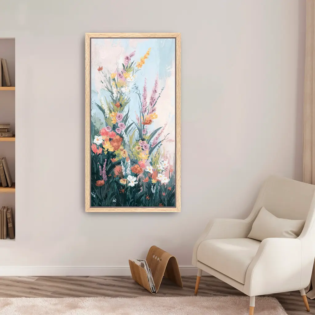 Bursting with lively blooms in shades of coral, yellow, and lavender, this impressionistic floral artwork radiates the joyous energy of a sunlit garden in full bloom. The soft blue and pink background adds a dreamy contrast, perfect for brightening any space with natural beauty. Our Gallery Wrap Canvas Prints are proudly assembled with high quality materials in California, USA. Each piece is printed on a thick, archival grade canvas using Giclee technology. It is then hand-stretched by our experienced artisans over solid wood bars, which will not warp over time. The final product is a piece personally crafted for you to confidently display on your wall. Care and Assembly: Ensure that the location of your piece has little to no exposure to heat, sunlight, and moisture. Wipe clean, only if needed. Each piece includes hanging hardware to hang on your wall vertically.