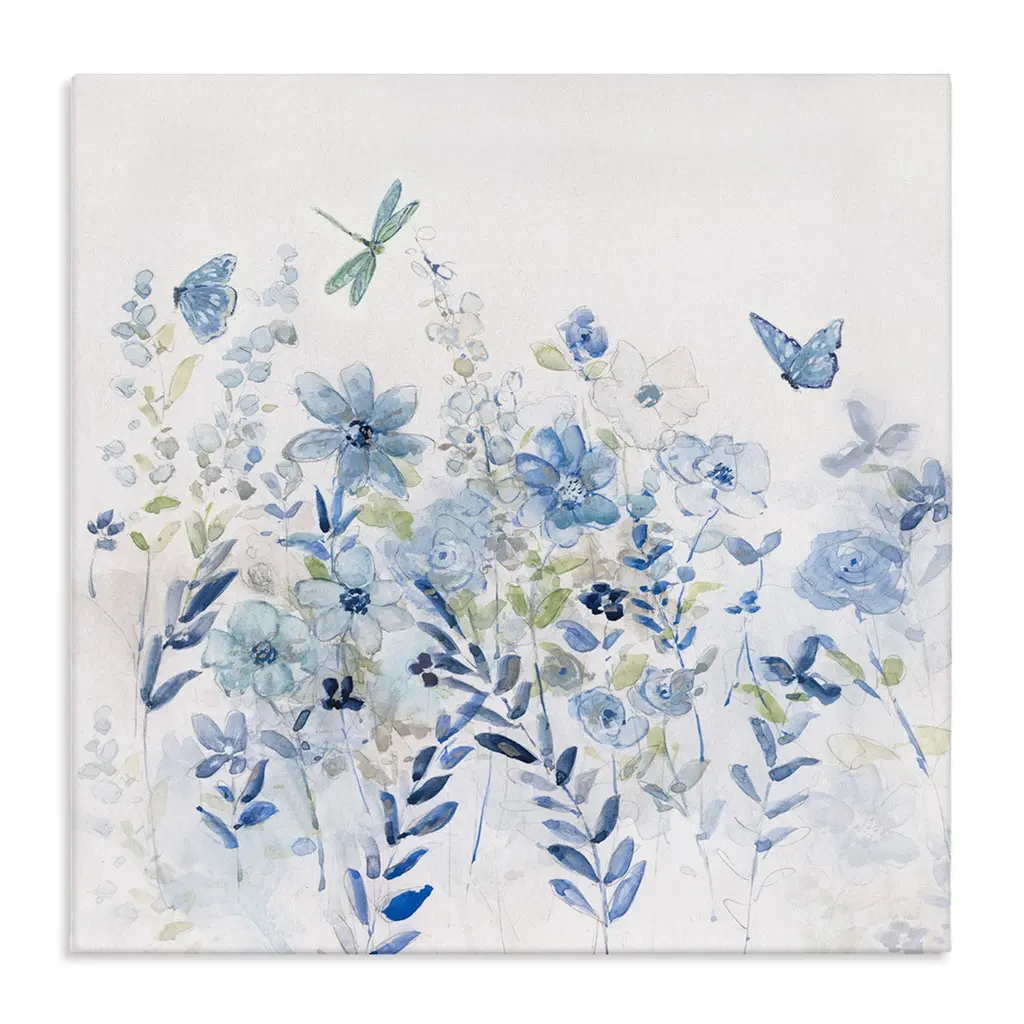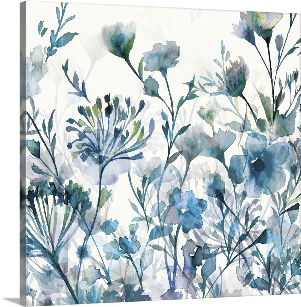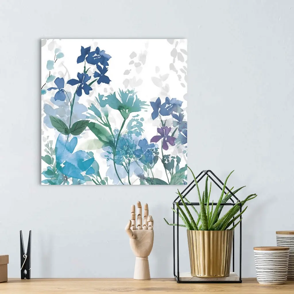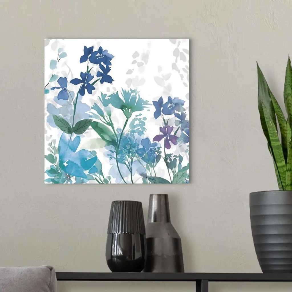 Contemporary artwork of a garden full of blue and purple flowers on a white background.