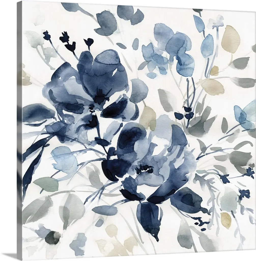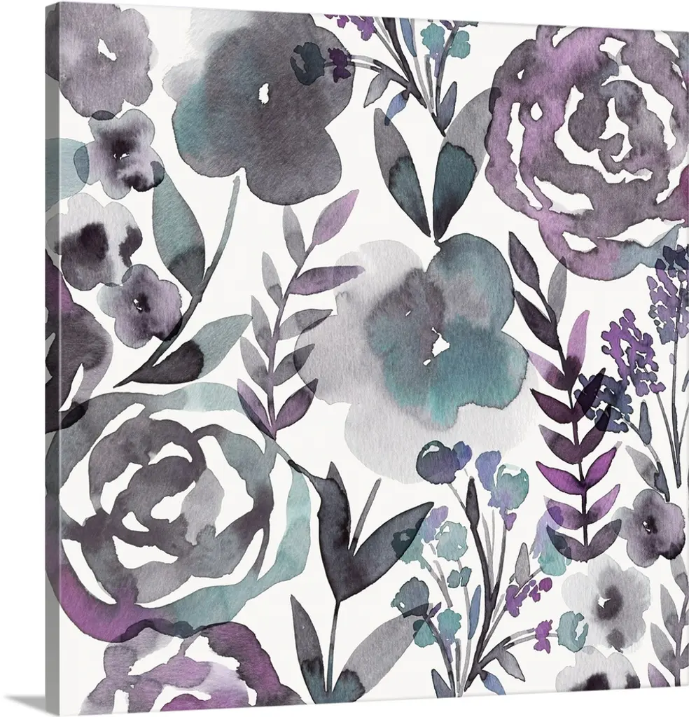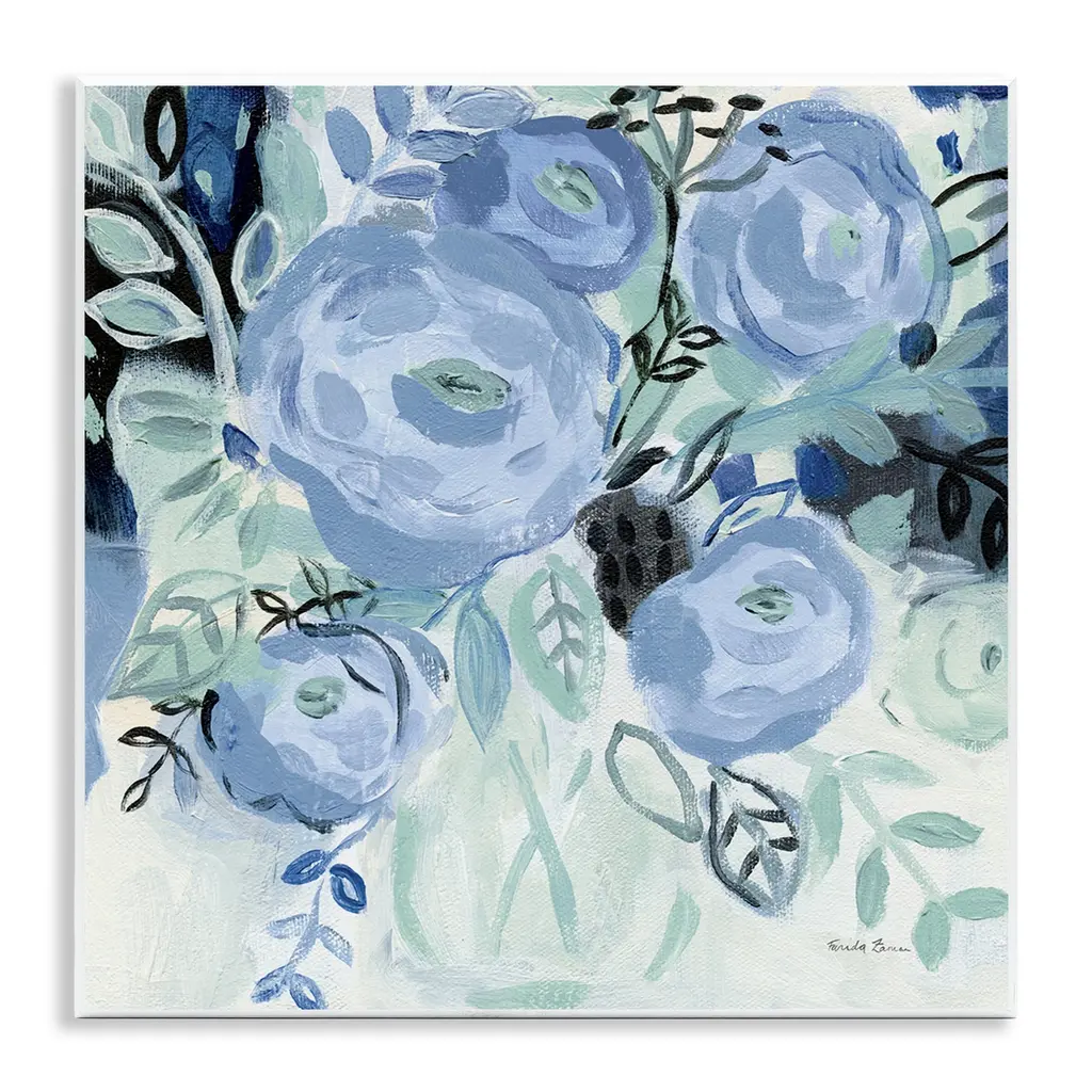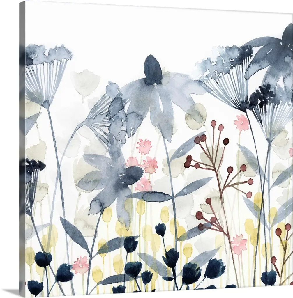 Contemporary artwork of a garden full of blue and purple flowers on a white background.