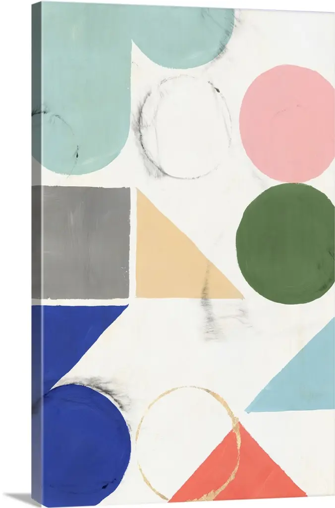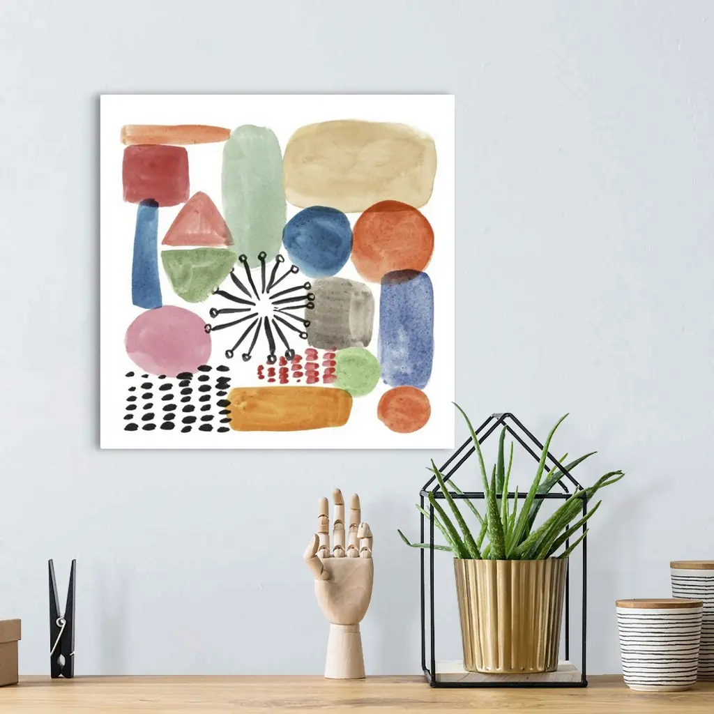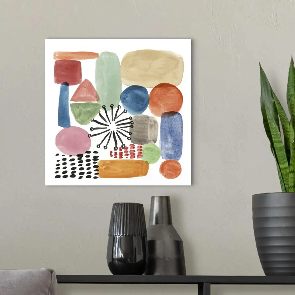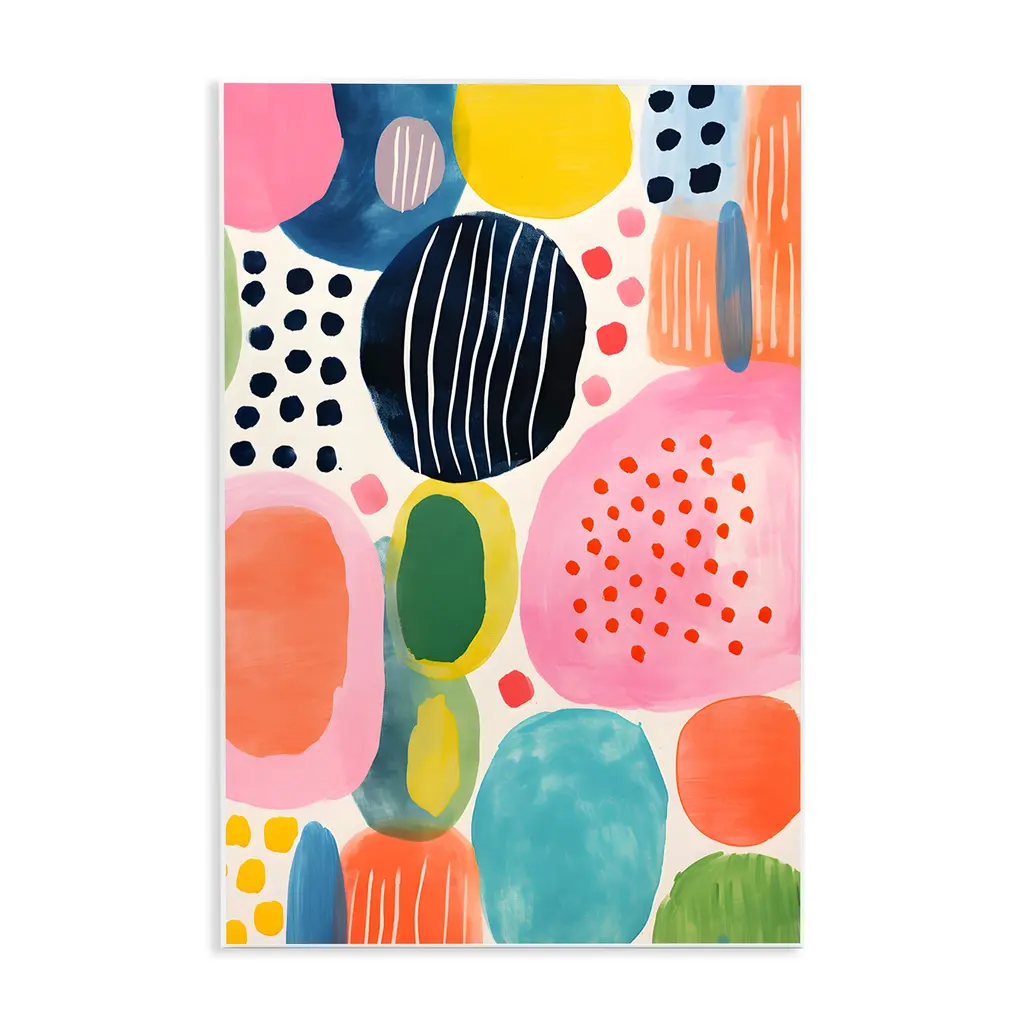 Whimsical abstract painting of various multi-colored shapes.