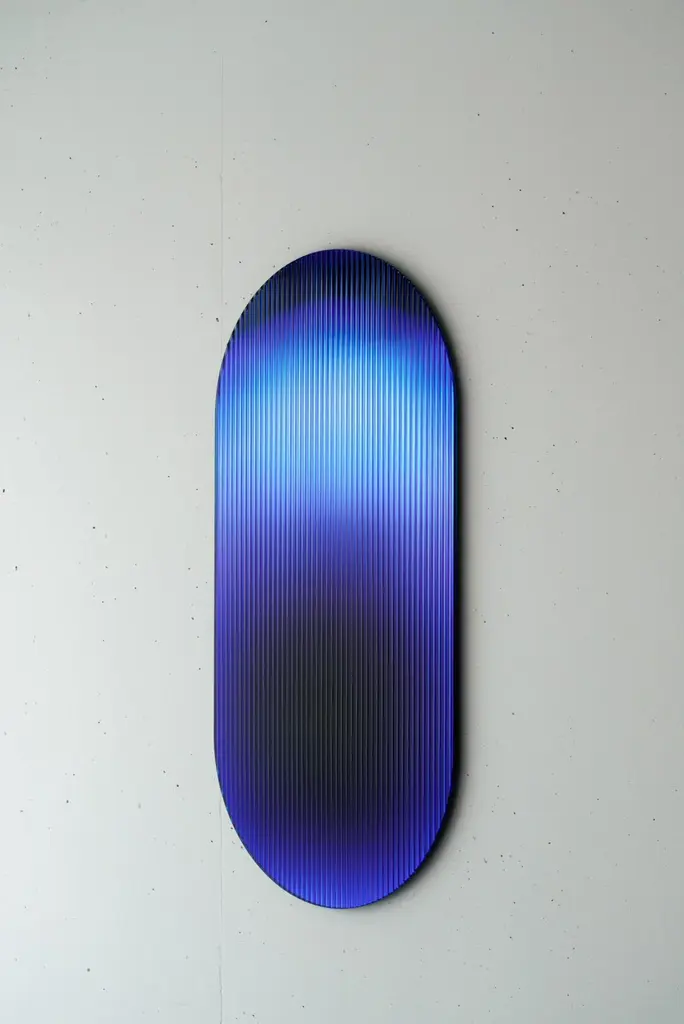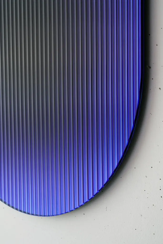 The reflective, coloured, rippled glass panel – designed to add a palette of colour to spaces – reflects light in spaces and adds movement and color whilst creating abstracted reflections. The piece disperses light through its rippled surface creating transitions of colour from various viewpoints. It works as an artistic object for spaces and has been designed with the intention of use for larger scale interior and architectural projects. It ships with a hanging system suitable for most wall types.Item is typically shipped in a custom wooden art crate which will be quoted separately with the shipping cost.