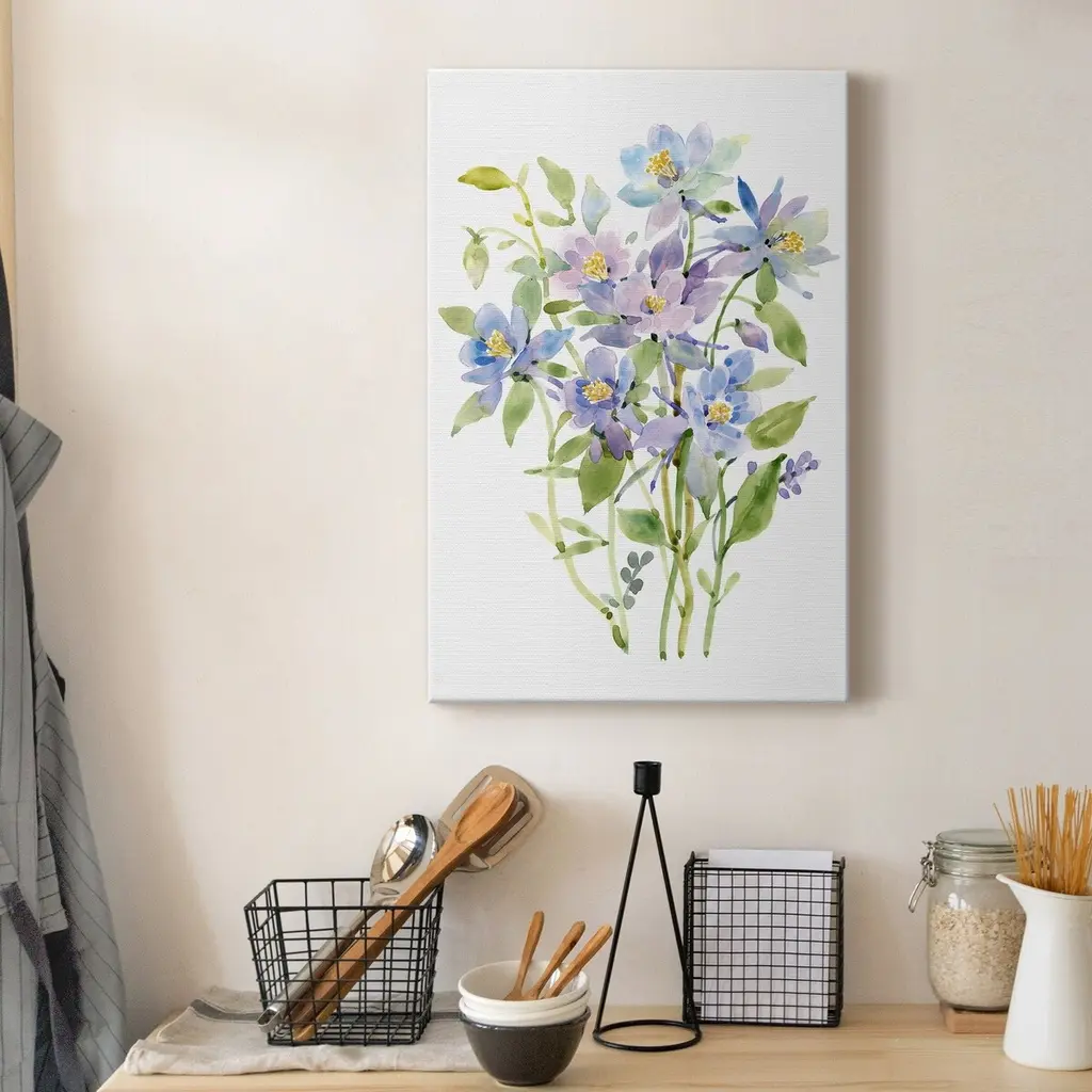 Columbine Spray II Premium Gallery Wrapped Canvas - Ready to Hang A premium hand stretched gallery wrapped canvas print created to last. Featuring a beveled a solid wood stretcher bar, each piece comes ready to hand 6 SIZES AVAILABLE 8''X12'' - Overall Size 12''X18'' - Overall Size 18''X27'' - Overall Size 24''x36'' - Overall Size 32''x48'' - Overall Size 40''x60'' - Overall Size Each piece is made to order. Built to Last Each piece comes ready to hang Solid wood stretcher Fade and Water resistant Made domestically