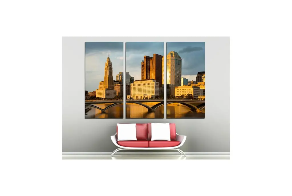 24“ x 16“ total size. Ready To Hang! (3 pieces - 8“ x 16“ each). 3 Panel Split (Triptych) aerial photography Canvas Print ft. beautiful evening view of Columbus Ohio Skyline at Sunset, USA. Home or office room wall decor & interior design Giclee print.. OBA free Giclée print wall art. Gallery Wrap - Image wraps around sides of the stretcher bars. Can be hanged without any decorative frames.Canvas Giclee Wall ArtMade in USAReady to hangSawtooth hangers on the backHand stretched on 1.5“ wooden stretcher barsFade resistant, OBA free canvas350gsm, 18mil poly/cotton canvasUV-protective coatingGallery Wraped with mirrored edgesEpson printing processFor indoor use