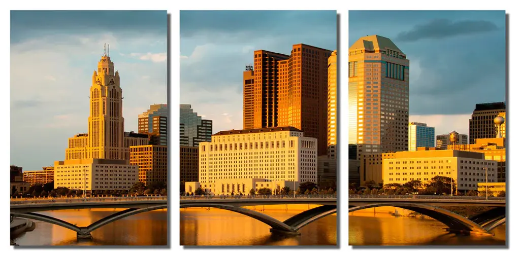 36"œ x 18"œ total size. Ready To Hang! (3 pieces - 12"œ x 18"œ each). 3 Panel Split (Triptych) Metal Print of Columbus Ohio Skyline. Modern metal wall art for home or office wall decor & interior design. Printed on Luxurious, HD aluminum glossy metal panels. Multi panel art.. HD aluminum panels. Metal print wall art. Includes Shadow Wall Mount on the back.• Aluminum Metal Wall Art• Made in USA• Ready to hang - No assembly required• Shadow mount hardware on the back• 0.045"œ thick HD Aluminum Panels• Scratch resistant, glossy finish• Superb color clarity, luxurious prints• Epson printing process• For indoor or moisture rich environment use• Easy to clean. Gently wipe with microfiber cloth.
