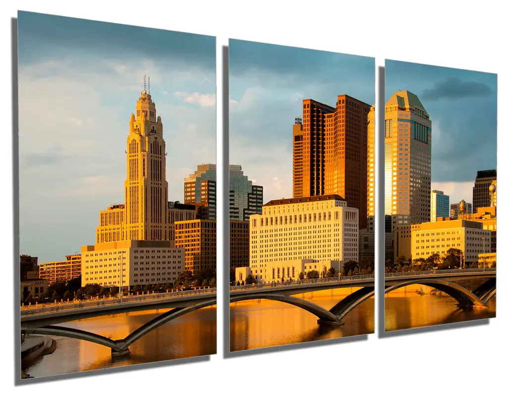 36"œ x 18"œ total size. Ready To Hang! (3 pieces - 12"œ x 18"œ each). 3 Panel Split (Triptych) Metal Print of Columbus Ohio Skyline. Modern metal wall art for home or office wall decor & interior design. Printed on Luxurious, HD aluminum glossy metal panels. Multi panel art.. HD aluminum panels. Metal print wall art. Includes Shadow Wall Mount on the back.• Aluminum Metal Wall Art• Made in USA• Ready to hang - No assembly required• Shadow mount hardware on the back• 0.045"œ thick HD Aluminum Panels• Scratch resistant, glossy finish• Superb color clarity, luxurious prints• Epson printing process• For indoor or moisture rich environment use• Easy to clean. Gently wipe with microfiber cloth.