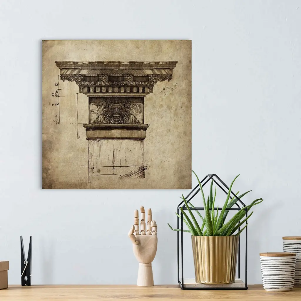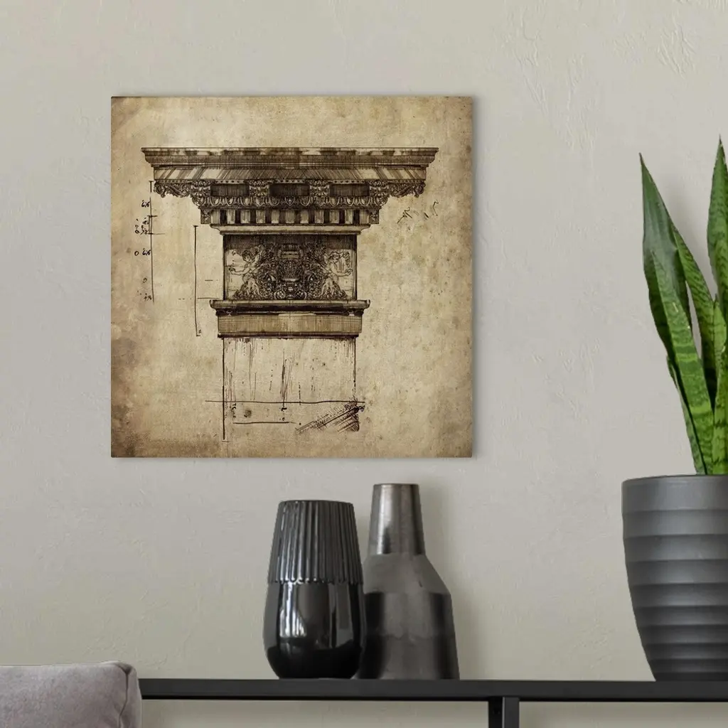 Contemporary artwork of an architectural drawing, in a weathered and rustic style.