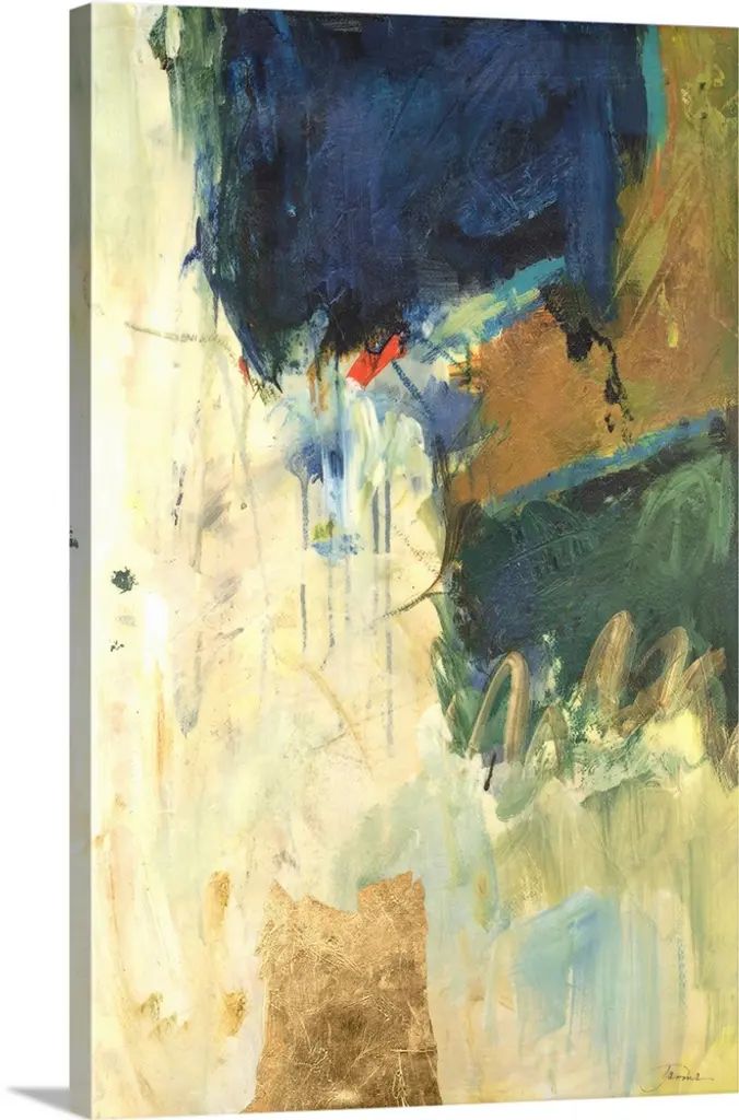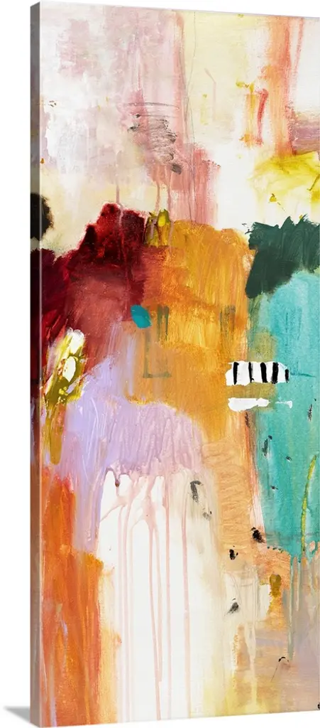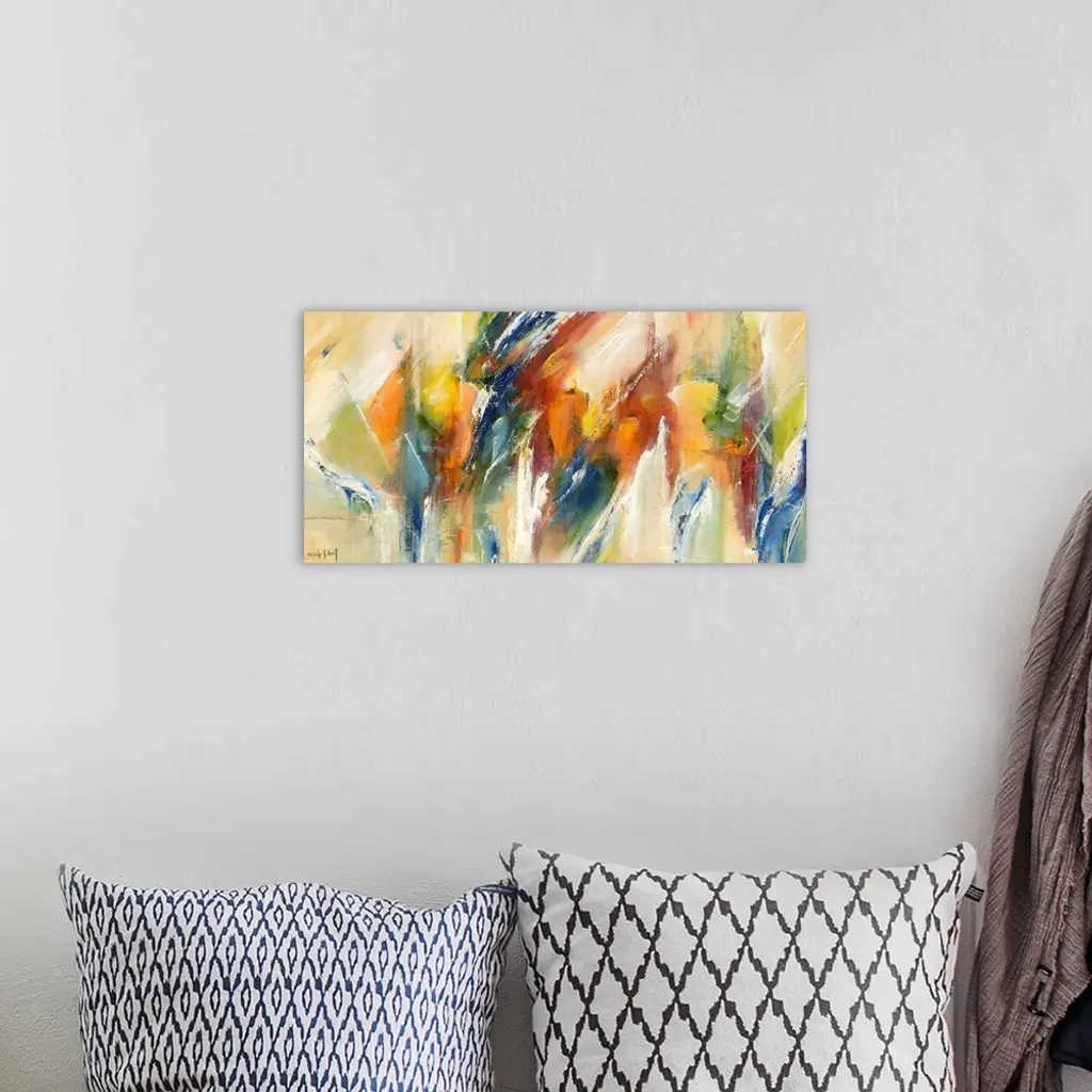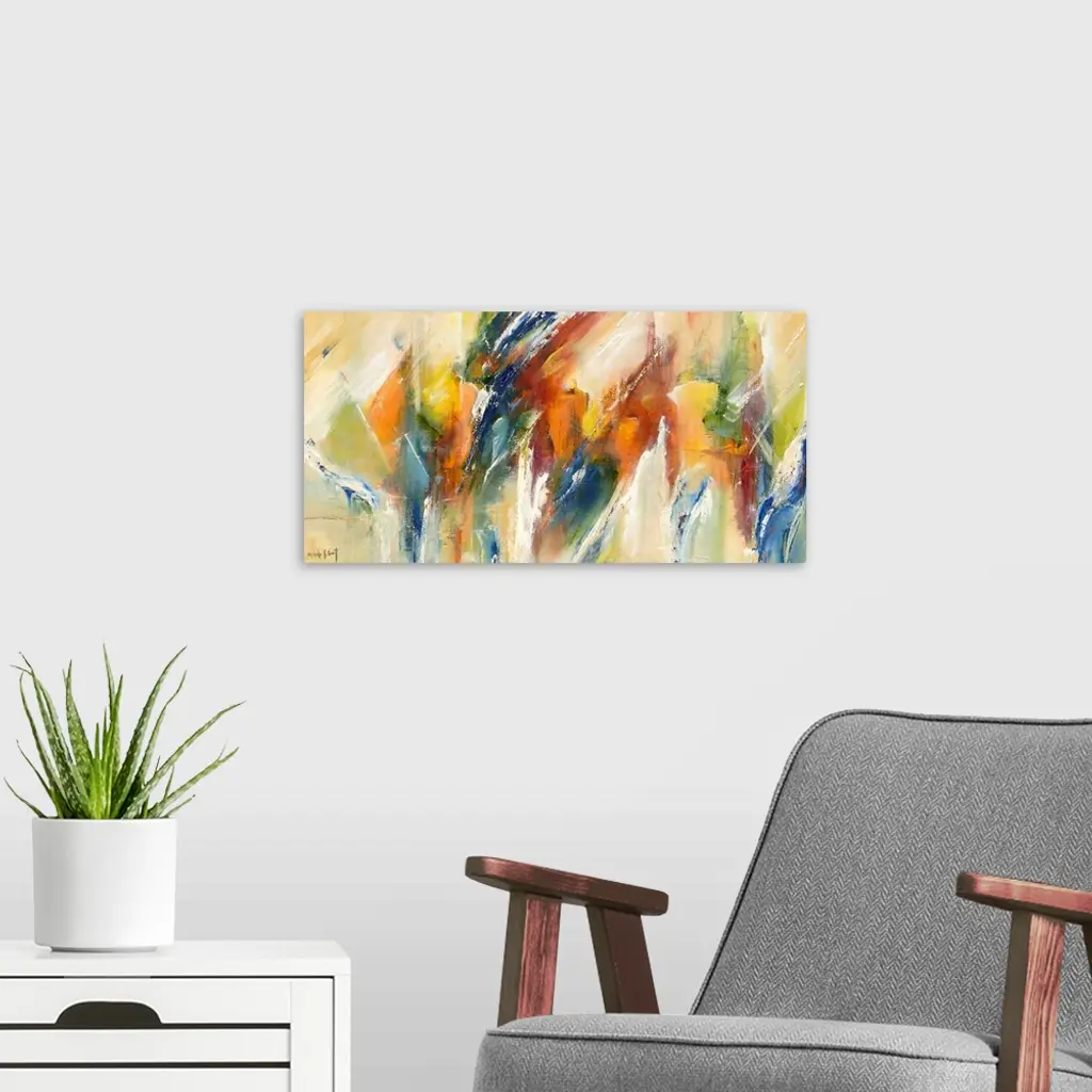 Large abstract painting in vibrant shades of blue, green, yellow, orange, and red with white brushstrokes on top.