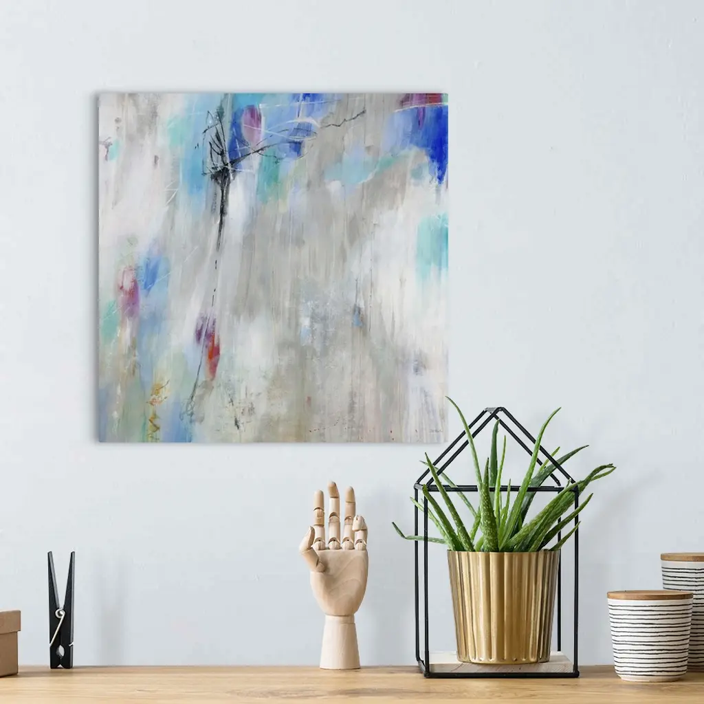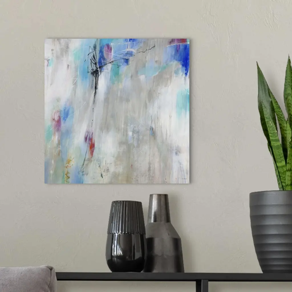 A contemporary abstract painting using splashes of light blue against a neutral background.
