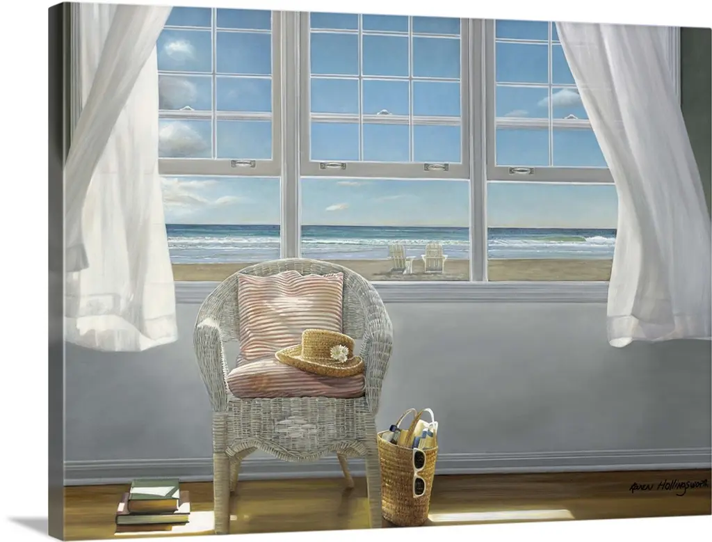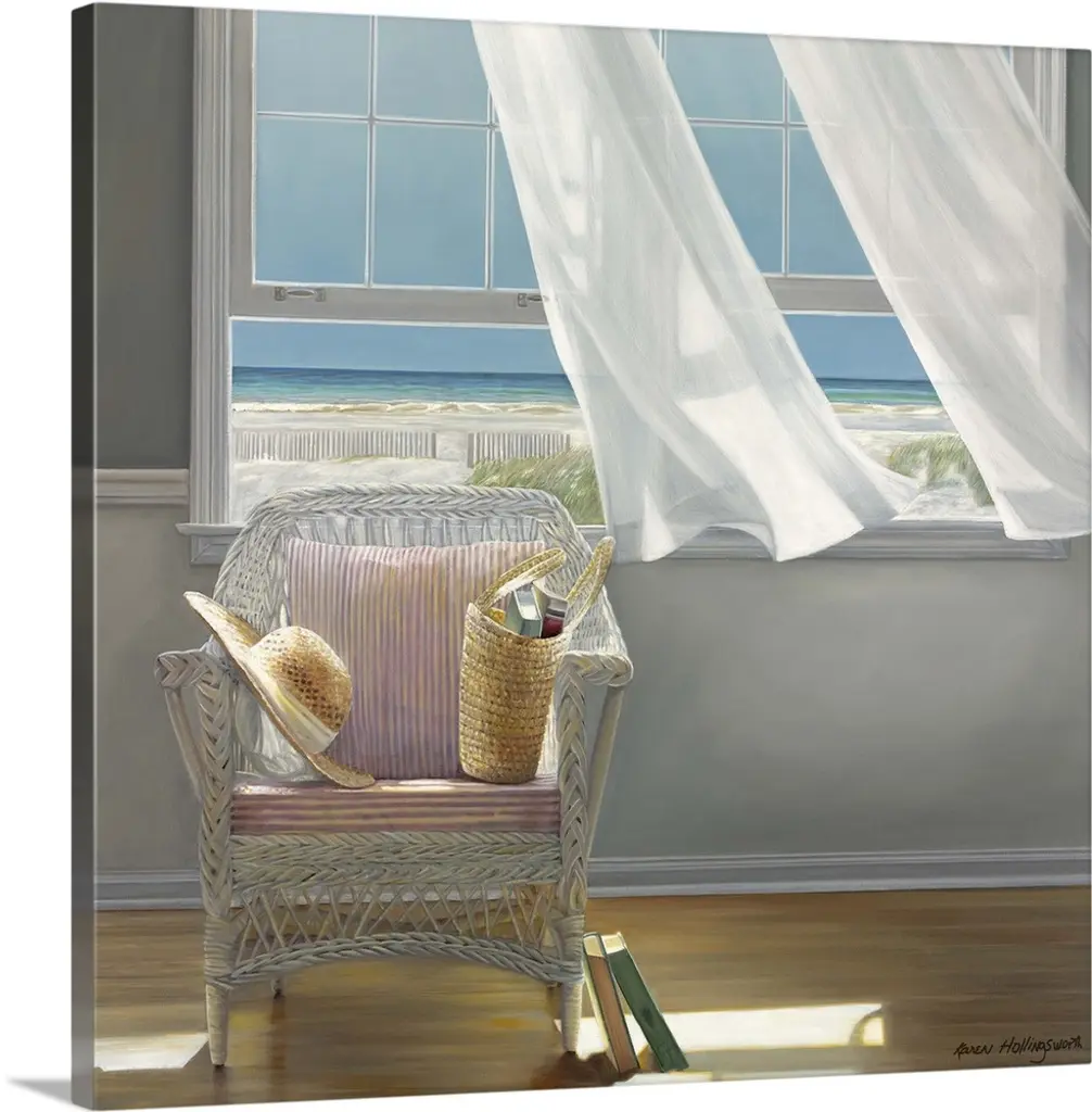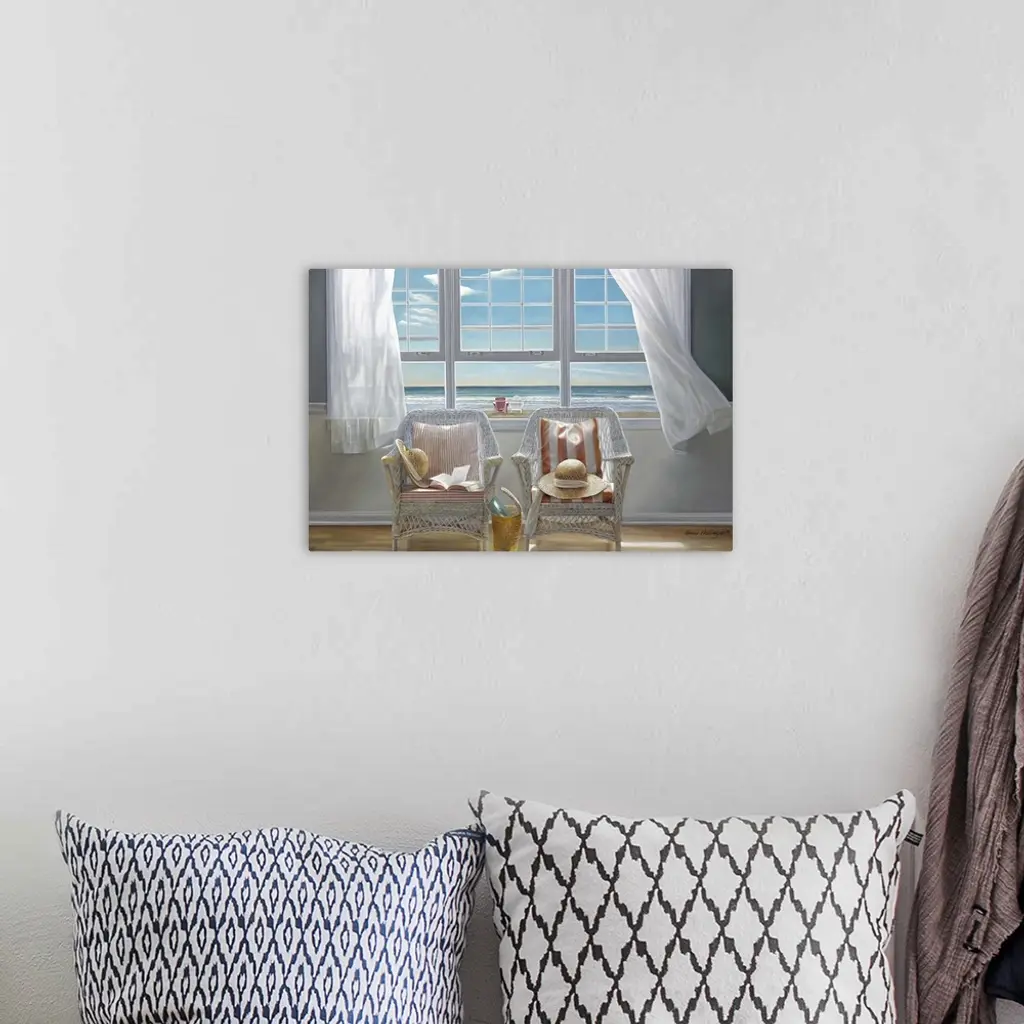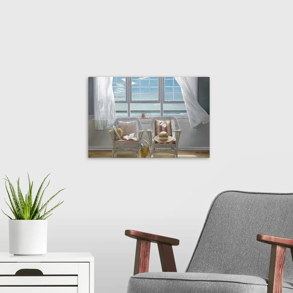 Contemporary painting of two chairs sitting in a sunlit room, with an open window and drapes being blown in the wind.