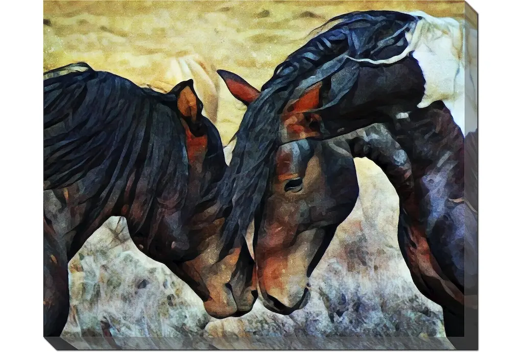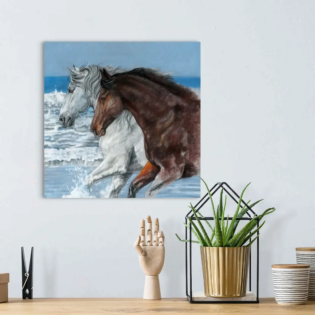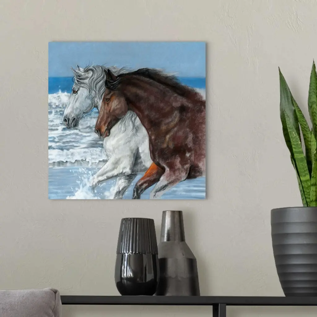Artwork of a white and a brown horse galloping through ocean water on a beach.