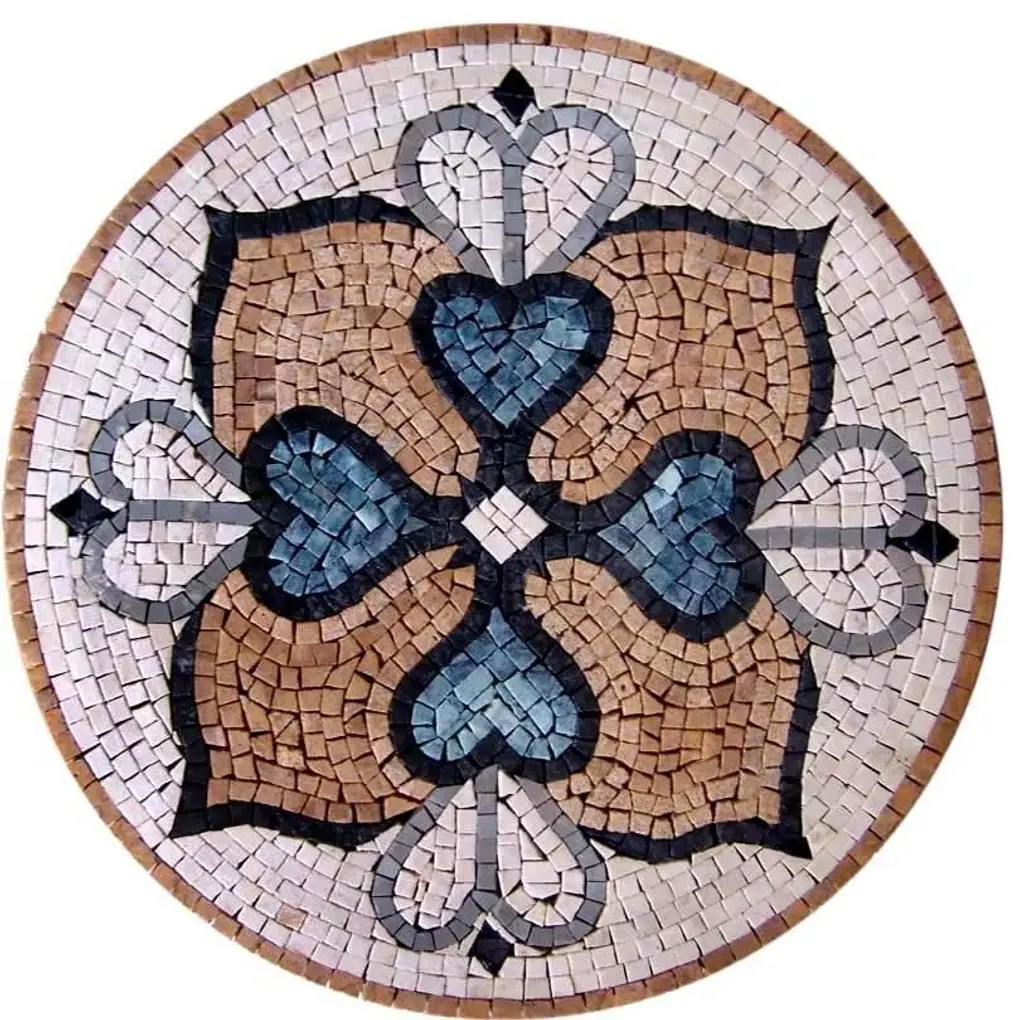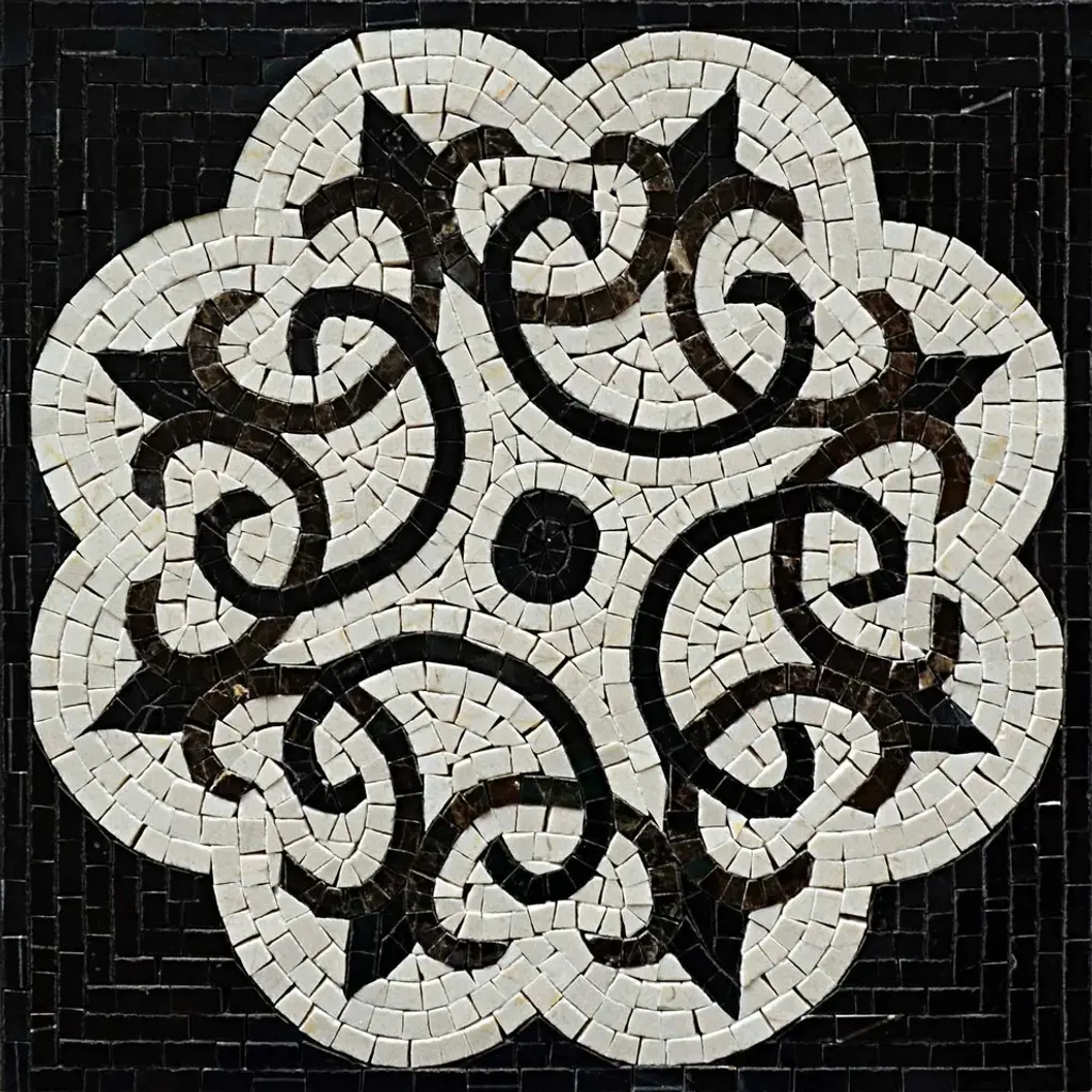 Exhibiting both remarkable complexity and timeless elegance, this square mosaic art features an ornamental design composed of seemingly interwoven geometric shapes and stylized floral motifs, rendered in classic black and white stone tiles. Handcrafted with meticulous attention to detail, the intricate pattern creates a visually rich and sophisticated artwork, bearing a resemblance to mandala designs with its radial symmetry and layered complexity. The precise placement of each tile contributes to the overall harmony and visual impact of this striking piece.
