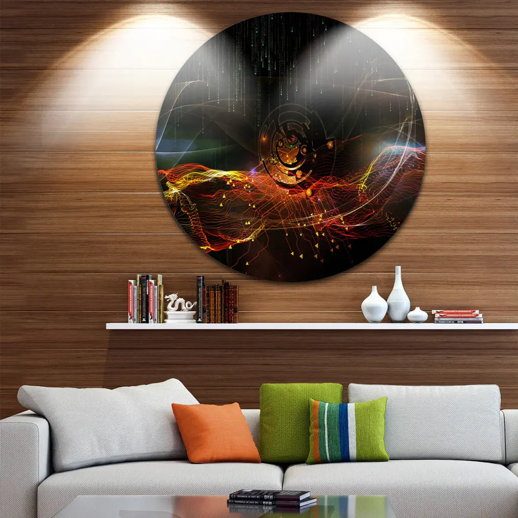 Bring Contemporary Abstraction to your home with this large Circle Metal wall art. This Composition of Elements Metal Artwork makes it the focal point of any room or office. - White Gloss Coating ensures colors are extra vibrant with light reflection.- Aluminum grade Sheet Metal with 1 inch mounting frame on the back giving the illusion that the artwork is floating on the wall..- Mounting Brackets are included along with instructions.- High Quality Digital images are created directly into a glossy aluminum panel producing a stunning and captivating print into the glossy finish of the metal.- Water, Fire and Scratch resistant HD Aluminum panels.- Looks better than any photo paper and guaranteed to last at least 20 years- Easy to clean with a microfiber cloth. Colors are far superior to regular Canvas Art. - Easy to Hang