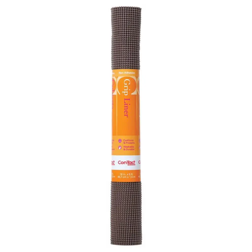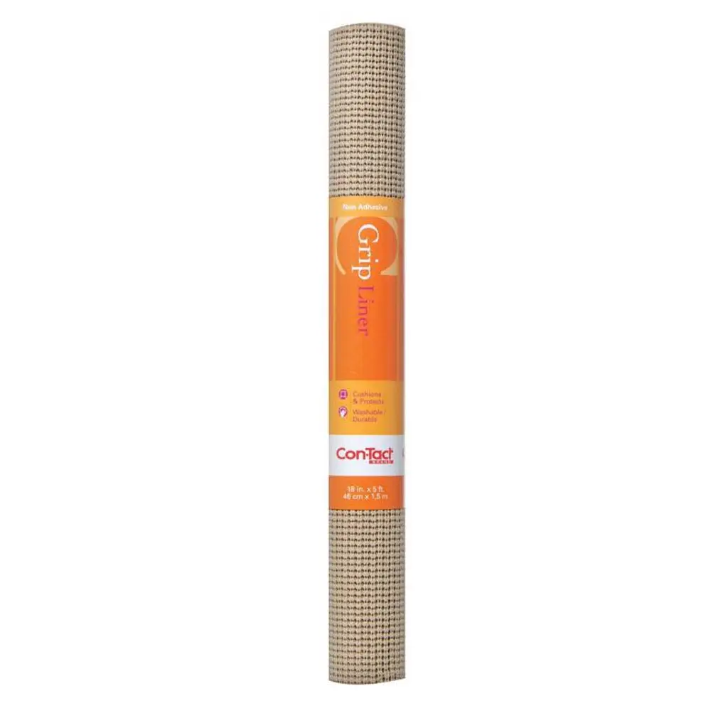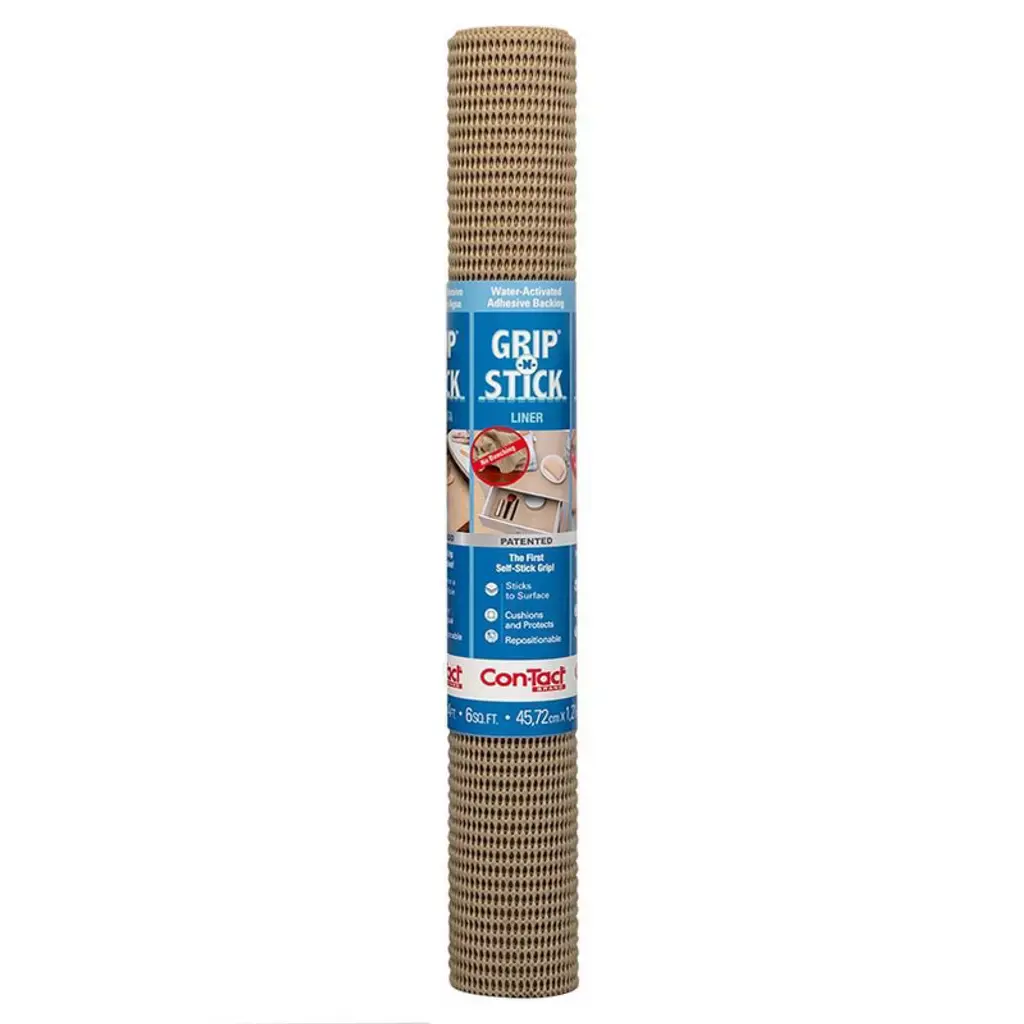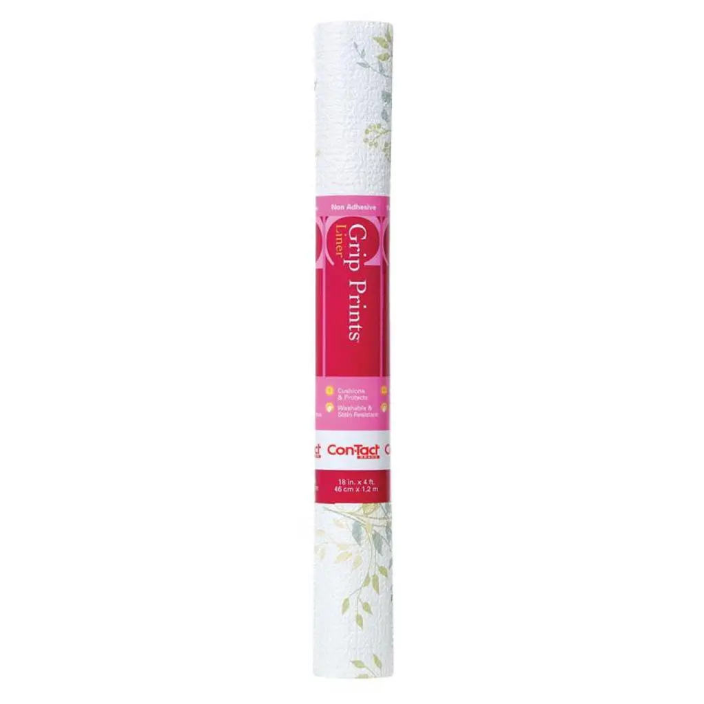 Con-Tact Brand Grip Prints drawer and shelf liner features a vinyl top surface with a non-adhesive grip backing. It offers a smooth and decorative waterproof top surface that is durable and protective while the bottom side is a cushioned non-adhesive grip that stays firmly in place without adhesives. The liner helps protect utensils and dishes from the surface they are stored on.
