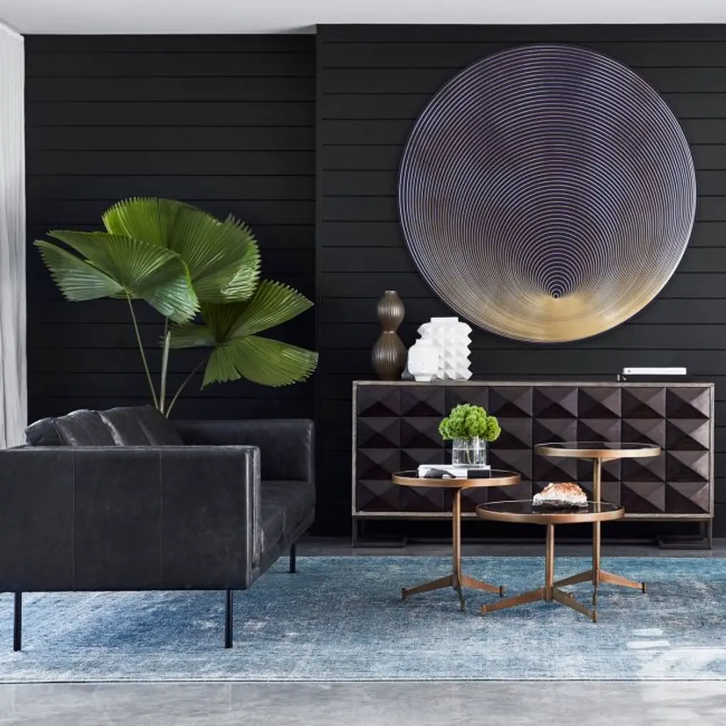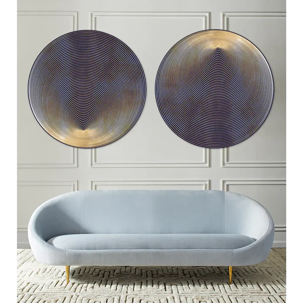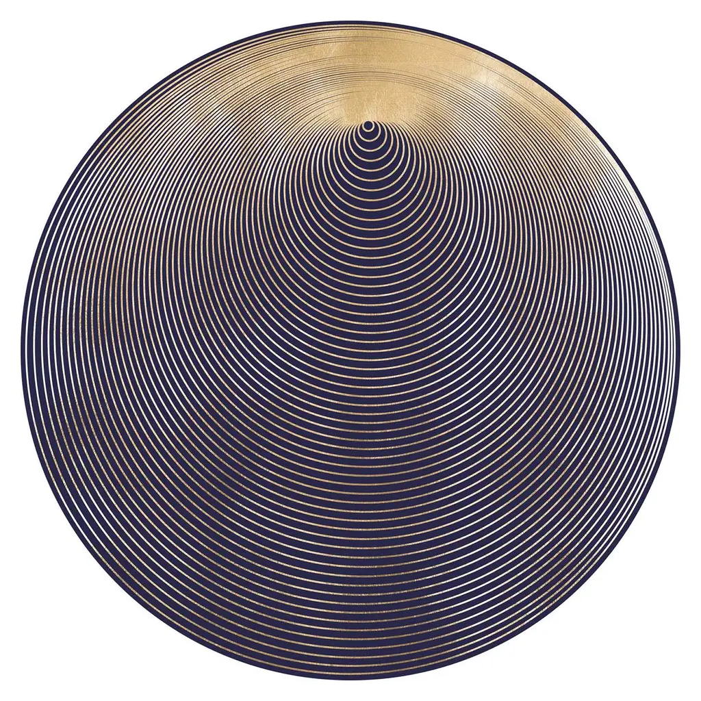 Using recent techniques, this design is printed on a gold aluminum with dark blue ink on top of many circles, creating a modern abstraction. The Art is then floated to create a dimensionality. Custom made in California.